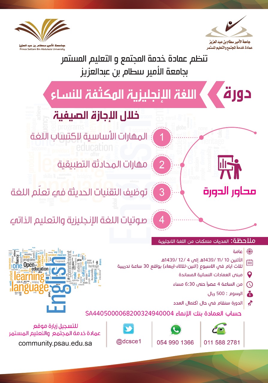 تنظم عمادة خدمة المجتمع والتعليم المستمر -الشطر النسائي- حالياً، دورة تدريبية بعنوان "اللغة الانجليزية المكثفة "،استهدفت فيها أفراد من المجتمع المحلي تستمر لمدة شهر وذلك في مقر العمادة بالجامعة