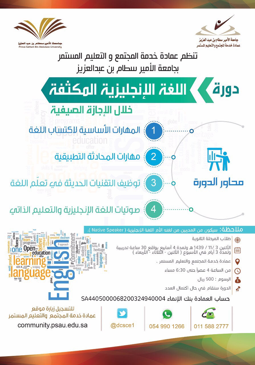 تعلن عمادة خدمة المجتمع والتعليم المستمر عن فتح باب التسجيل في دورة " اللغة الإنجليزيةالمكثفة " خلال الإجازة الصيفية .