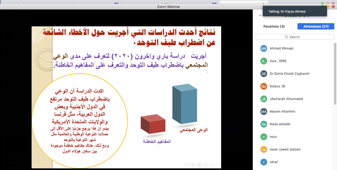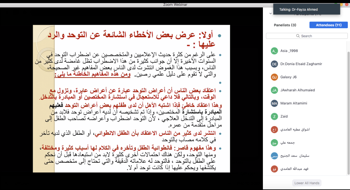 حيث نفّذت العمادة مساء أمس ، الدورة التدريبية " أخطاء شائعة عن التوحد " عبر منصة zoom قدمتها الدكتورة : فايزة إبراهيم أحمد أستاذ التربية الخاصة المشارك بكلية التربية بالخرج .