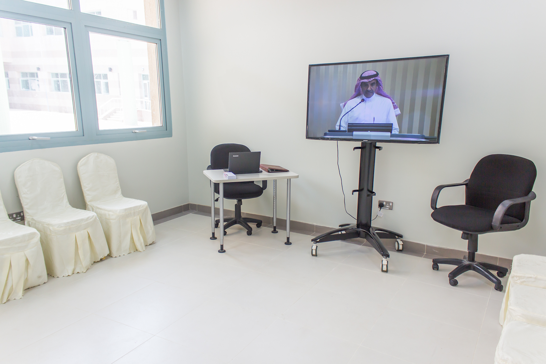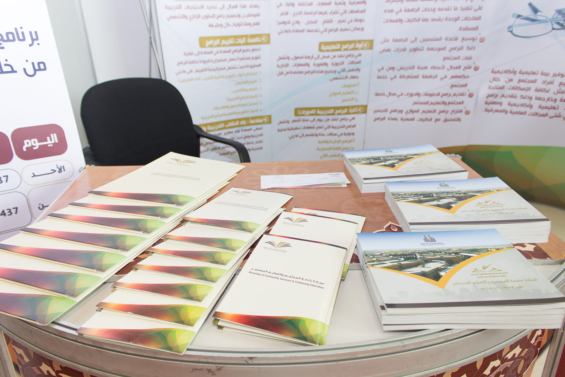 ويحتوي الجناح على قاعة تدريبية و برامج تعليمية لزوار المعرض و منشورات تعريفية بما تقدمه العمادة من خدمات للمجتمع .