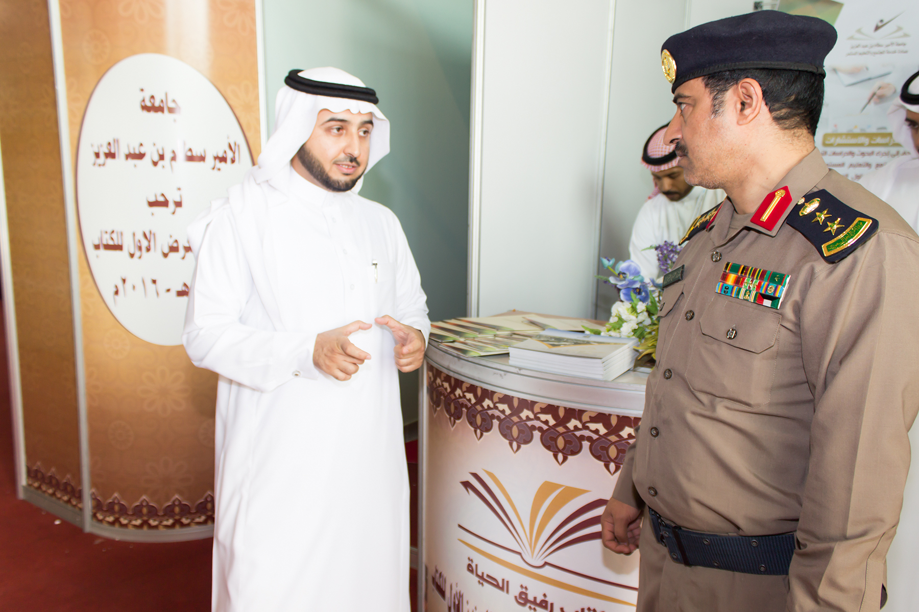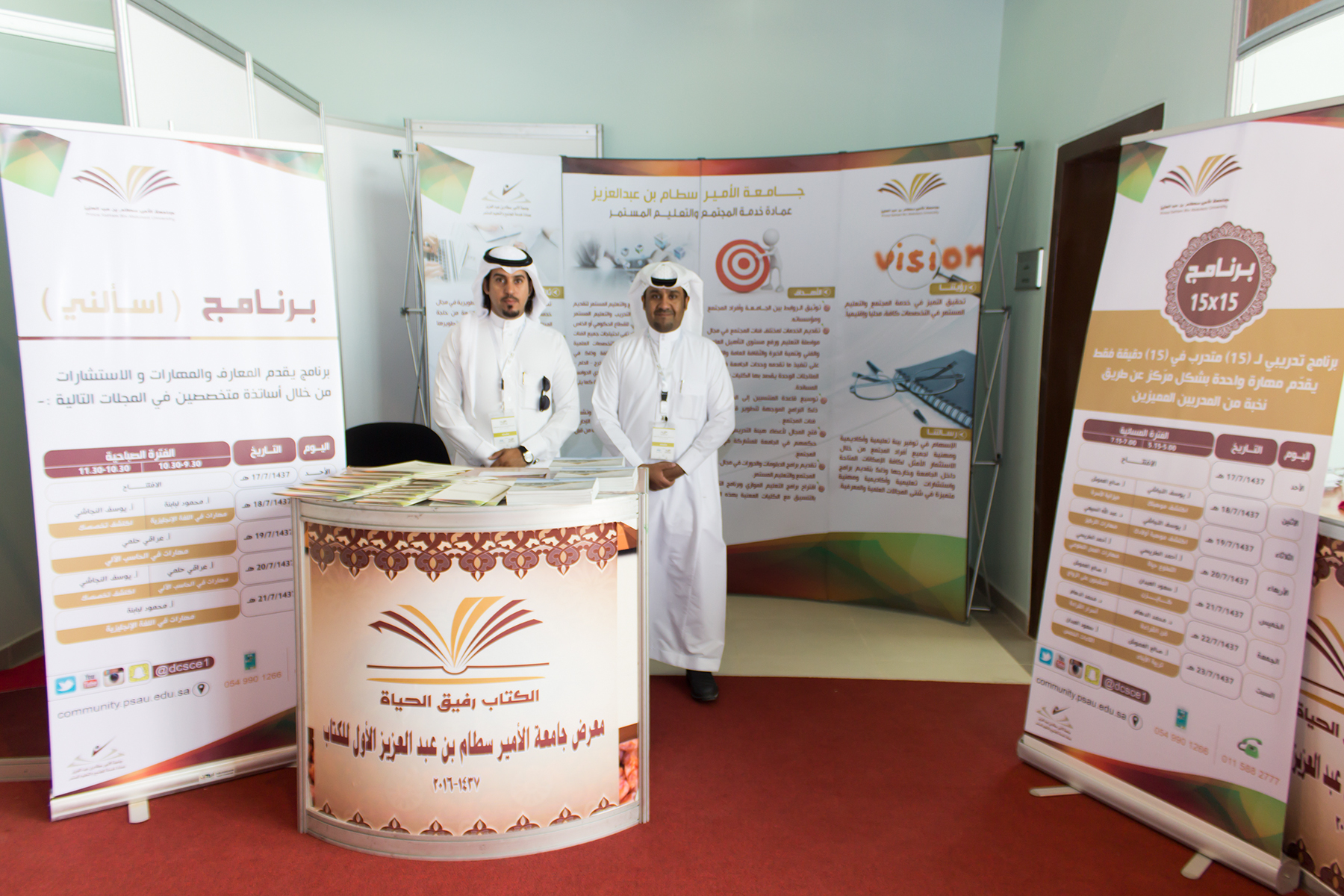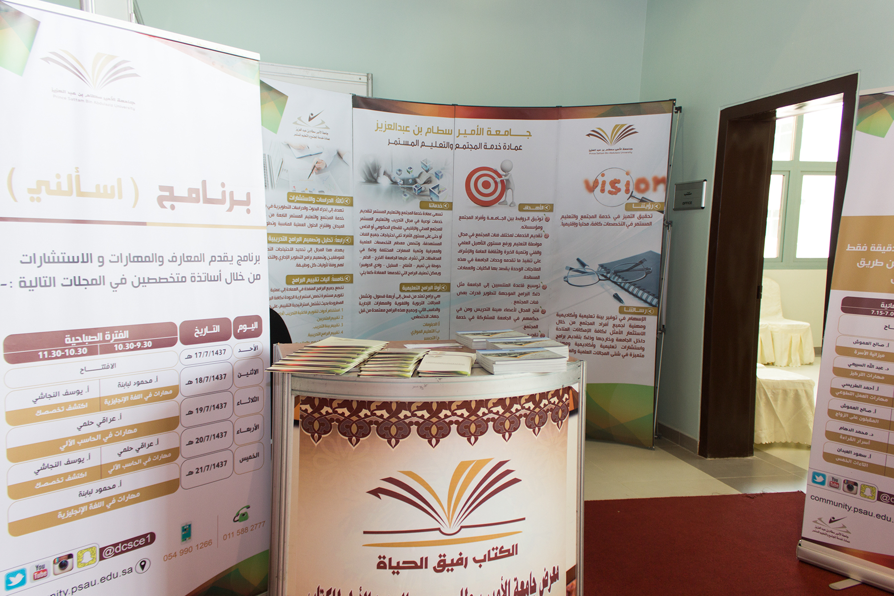 تشارك عمادة خدمة المجتمع والتعليم المستمر بجناح خاص ضمن معرض الكتاب الأول في جامعة الأمير سطام بن عبد العزيز والذي افتتح صباح الأحد الموافق 1437/7/17 تحت رعاية معالي مدير الجامعة وبتنظيم من عمادة شؤون المكتبات .