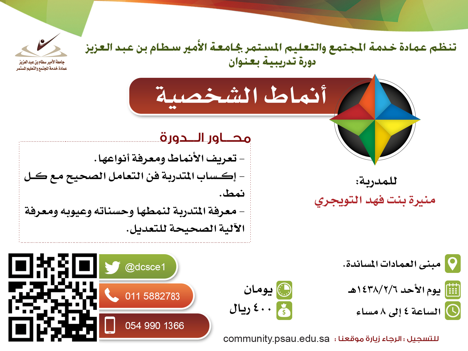 تسعد عمادة خدمة المجتمع والتعليم المستمر بجامعة الأمير سطام بن عبدالعزيز بالخرج (الشطر النسائي) بعقد دورة أنماط الشخصية، والتي تهدف إلى: