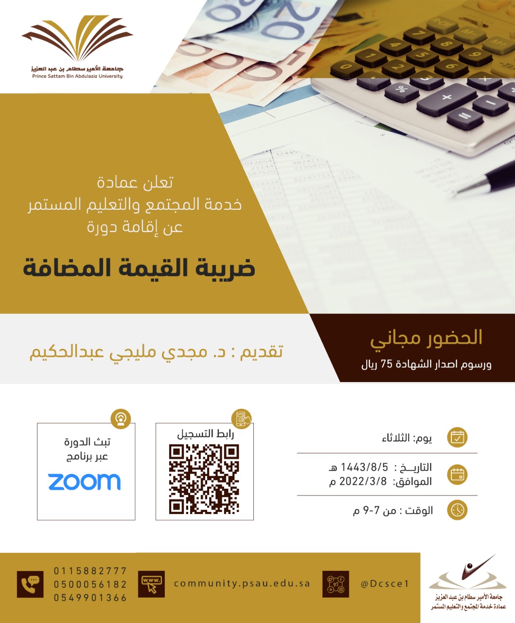 أعلنت عمادة خدمة المجتمع والتعليم المستمر بجامعة الأمير سطام عن إقامة دورة مجانية بعنوان ( ضريبة القيمة المضافة) عبر منصة zoom، وذلك يوم الثلاثاء 1443/8/5 هـ الموافق2022/3/8 م من الساعة 7- 9 مساءً حيث تستهدف موظفي المحاسبة والمراقبيين الماليين والمهتمين في المحاسبة والمالية، و تهدف إلى إكساب المتدربين الجدارات اللازمة لفهم وتطبيق نظام ضريبة القيمة المضافة ولائحته التنفيذية في المملكة العربية السعودية. علما بأن رسوم إصدار الشهادة 75 ريال.