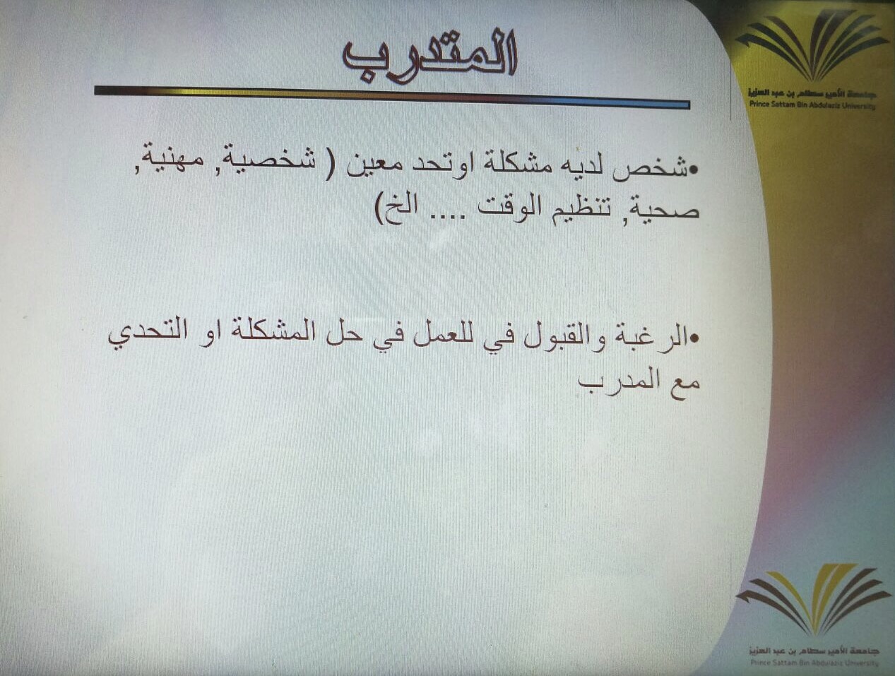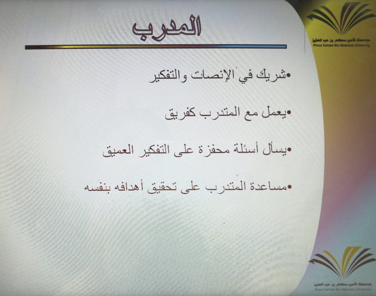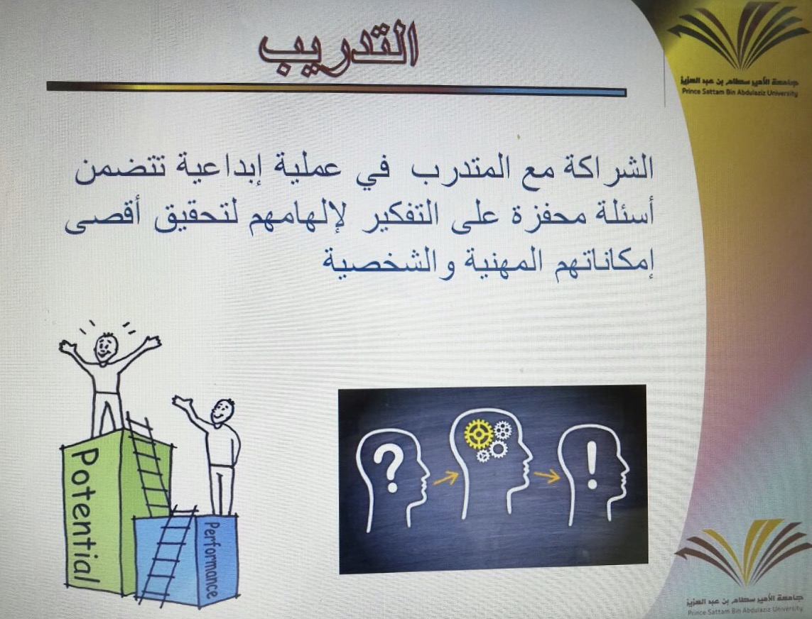 تم من خلالها مناقشة عدة أهداف منها أهمية فن الانصات لتحديد المشكلات وأهمية خلق بيئة من الخصوصية والارتياح في مكان العمل وأثر ذلك وانعكاسها على الموظفة وعلى أدائها في عملها كذلك أوضحت الفرق بين اعطاء الحلول وبين التعاون على ايجادها وبينت ذلك من خلال محادثة تدريبية مع أحد الحاضرات كذلك قامت باستخدام بعض الأنشطة منها تقسيم الحاضرات إلى مجموعات وعمل نشاط ذهني وسط تفاعل الجميع.