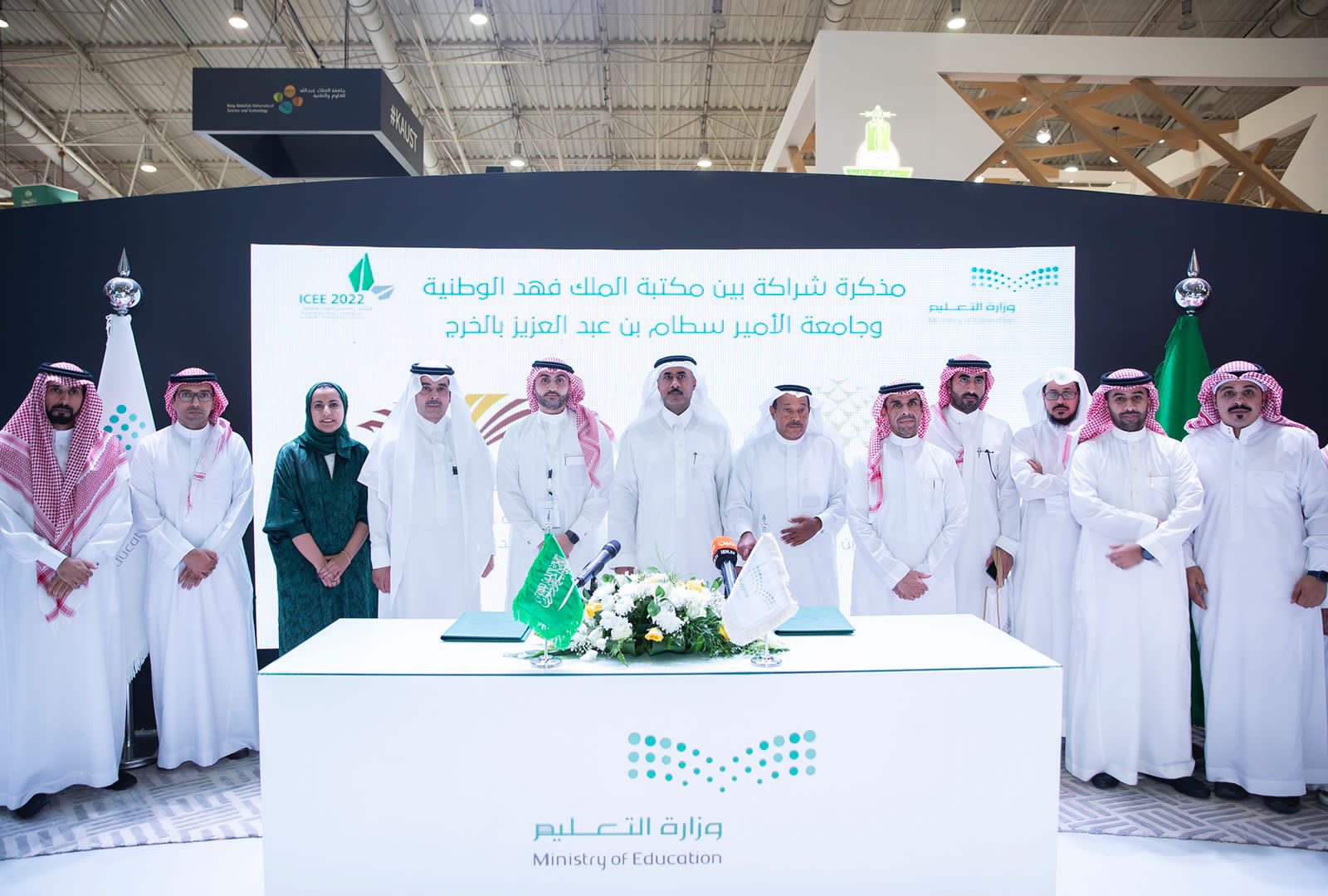 على هامش المؤتمر والمعرض الدولي للتعليم 2022م والمنعقد في مدينة الرياض ، وقعت جامعة الأمير سطام بن عبدالعزيز ممثلة بعمادة شؤون المكتبات ومكتبة الملك فهد الوطنية أمس الاثنين 8 / 10 / 1443هـ مذكرة تعاون بهدف تبادل الخبرات والتدريب والتعاون في مجالات البرامج التطويرية والبحوث والتبادل العلمي والثقافي والاجتماعي تساهم في الإثراء المعرفي ويحقق رؤية وطموحات الطرفين ، وقع الاتفاقية من جانب جامعة الأمير سطام بن عبدالعزيز وكيل الجامعة للدراسات العليا والبحث العلمي الدكتور عبدالله بن نضال عداس ومن جانب مكتبة الملك فهد الوطنية الأستاذ سليمان بن يوسف المسعود.