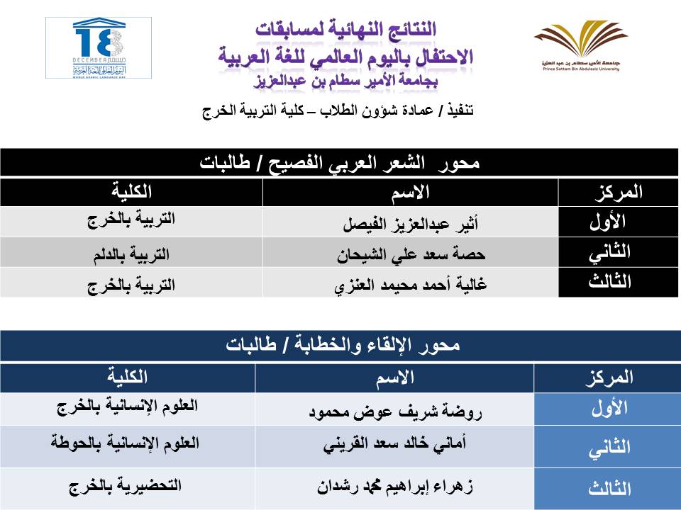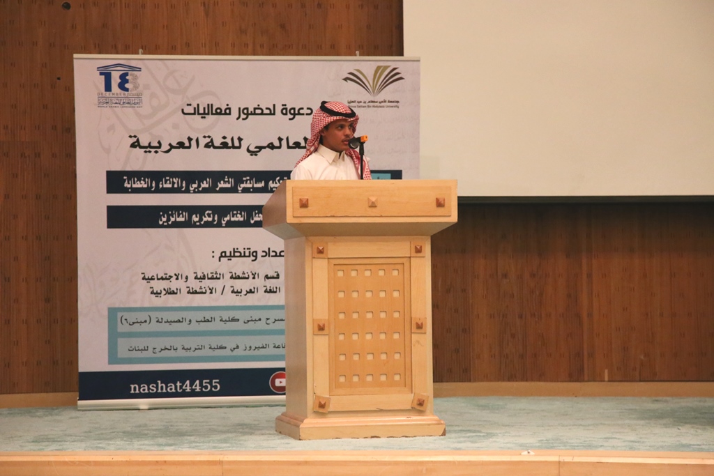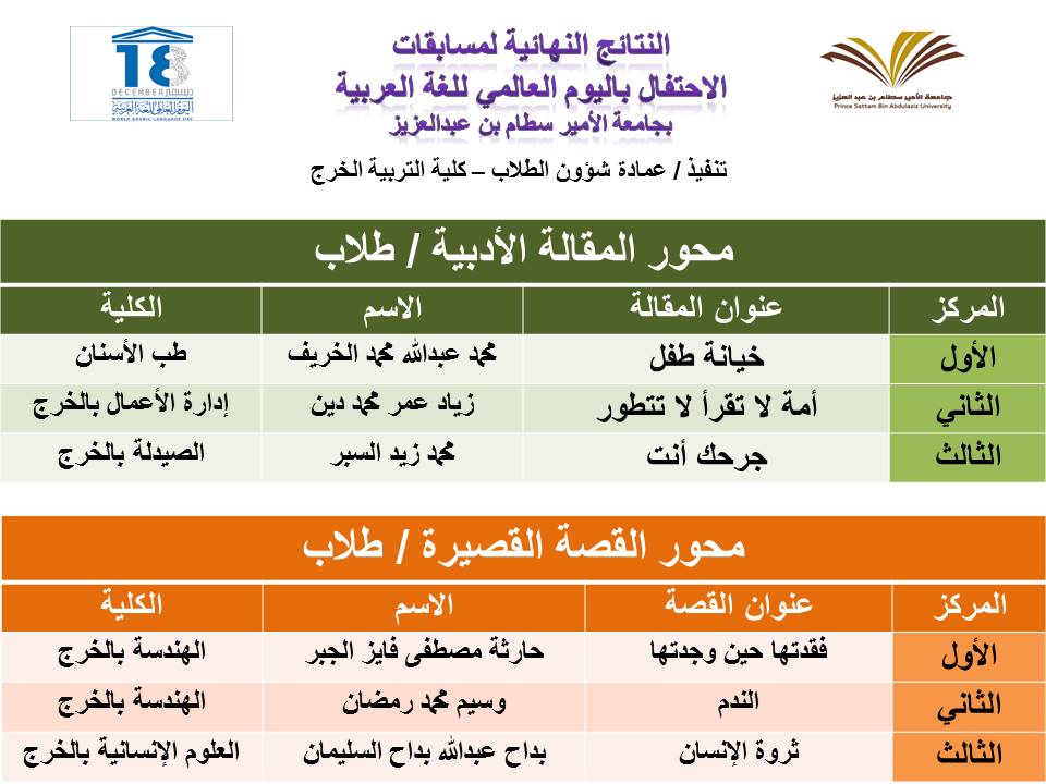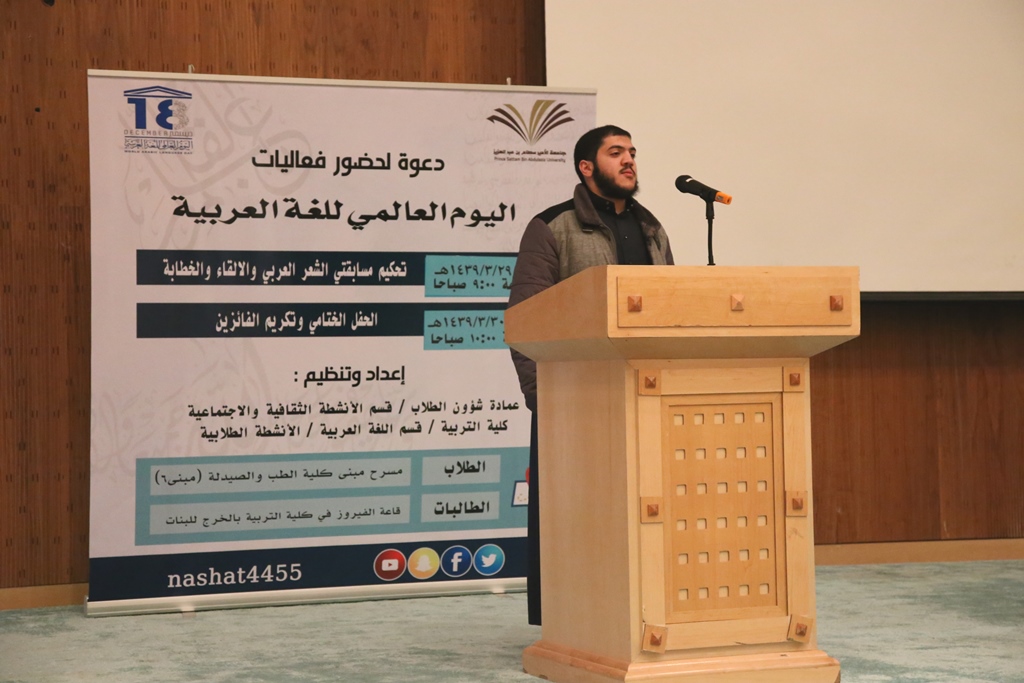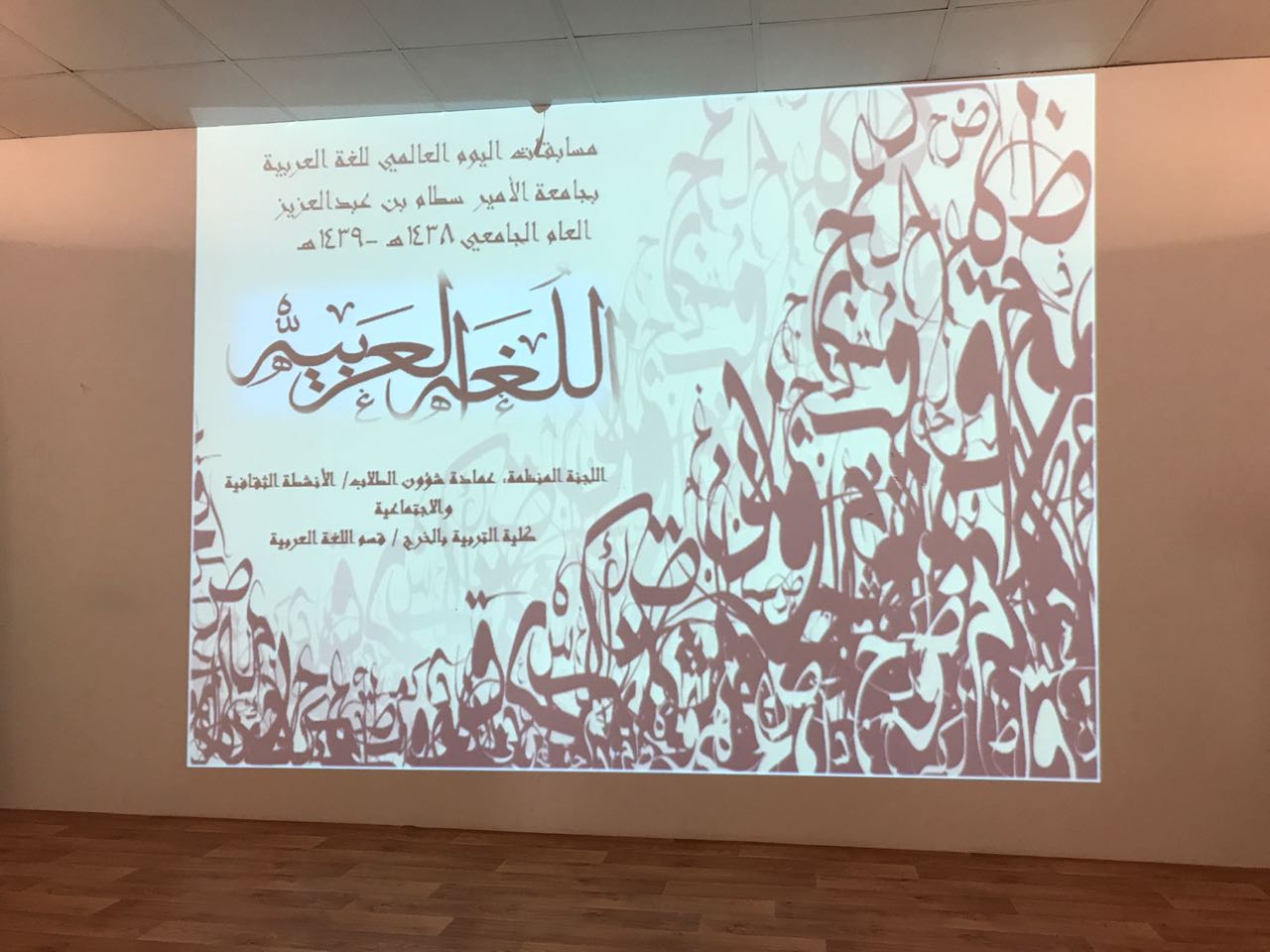 احتفت عمادة شؤون الطلاب بجامعة الأمير سطام بن عبد العزيز برعاية عميدها الدكتور ثلاب الشكرة بالتعاون مع قسم اللغة العربية والأنشطة الطلابية بكلية التربية بالخرج باللغة العربية في يومها العالمي، من خلال تنظيم مسابقة إبداعية شملت محاور منها (الشعر الفصيح، والإلقاء والخطابة، والمقالة الأدبية، والقصة الكثيرة)، حيث استمت المسابقة بالمشاركات المتعددة على صعيد الطلاب والطالبات، ومن خلال التحكيم العلني أعلنت اللجنة المنظمة أسماء الفائزين في محاور المسابقة.