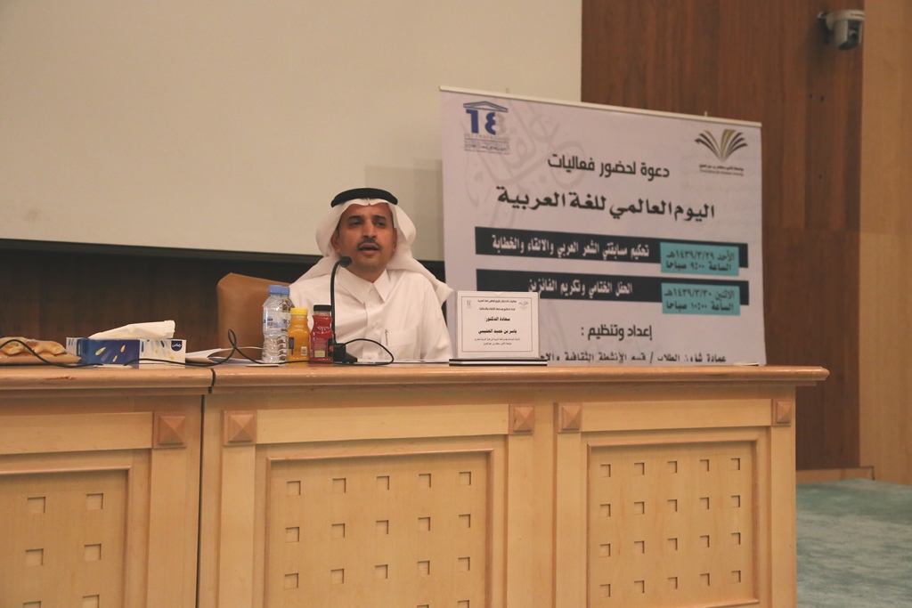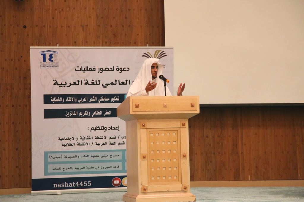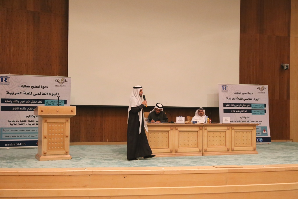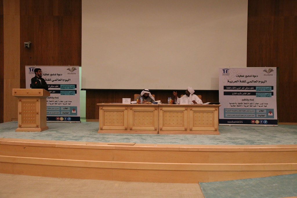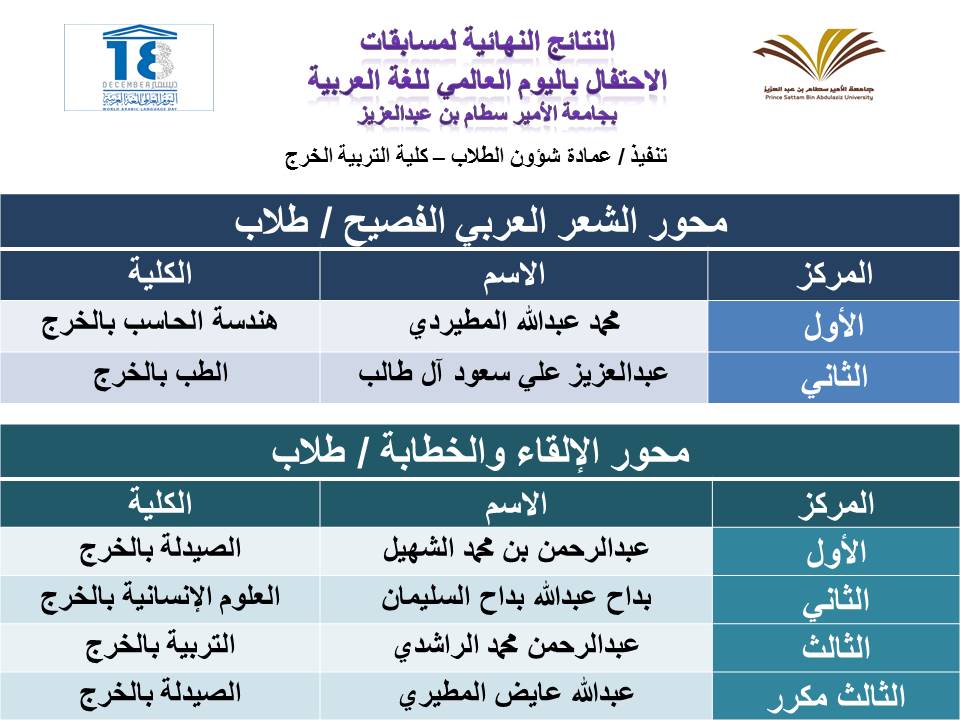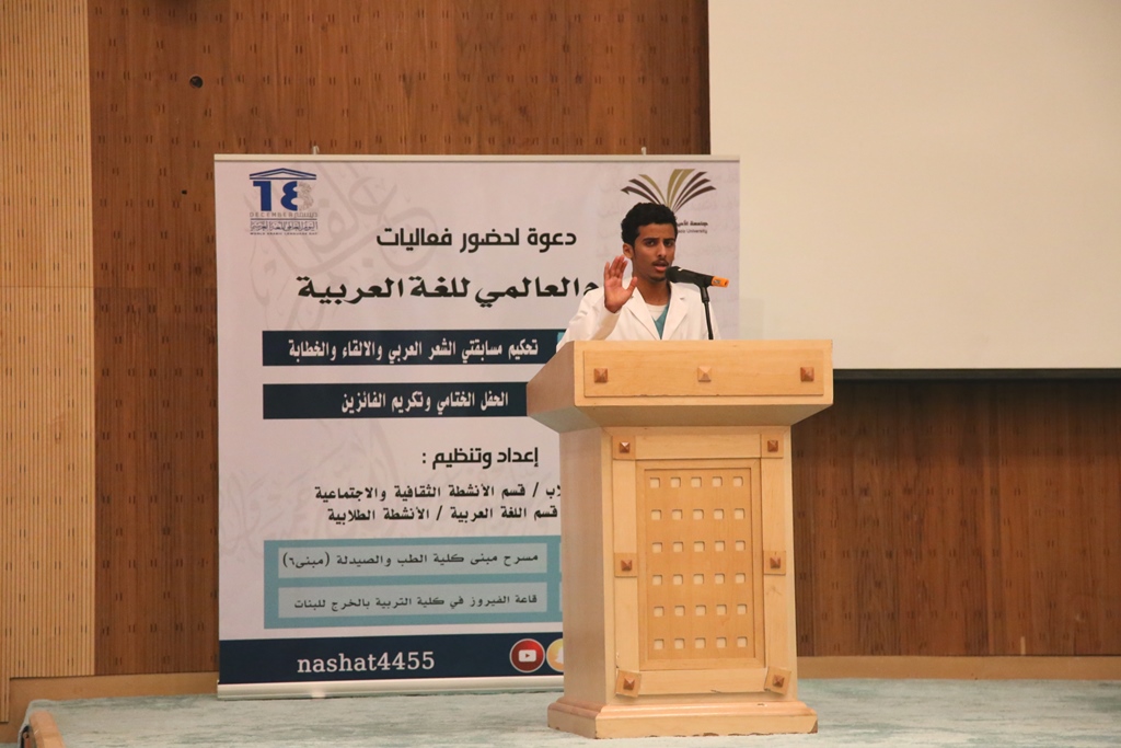 احتفت عمادة شؤون الطلاب بجامعة الأمير سطام بن عبد العزيز برعاية عميدها الدكتور ثلاب الشكرة بالتعاون مع قسم اللغة العربية والأنشطة الطلابية بكلية التربية بالخرج باللغة العربية في يومها العالمي، من خلال تنظيم مسابقة إبداعية شملت محاور منها (الشعر الفصيح، والإلقاء والخطابة، والمقالة الأدبية، والقصة الكثيرة)، حيث استمت المسابقة بالمشاركات المتعددة على صعيد الطلاب والطالبات، ومن خلال التحكيم العلني أعلنت اللجنة المنظمة أسماء الفائزين في محاور المسابقة.