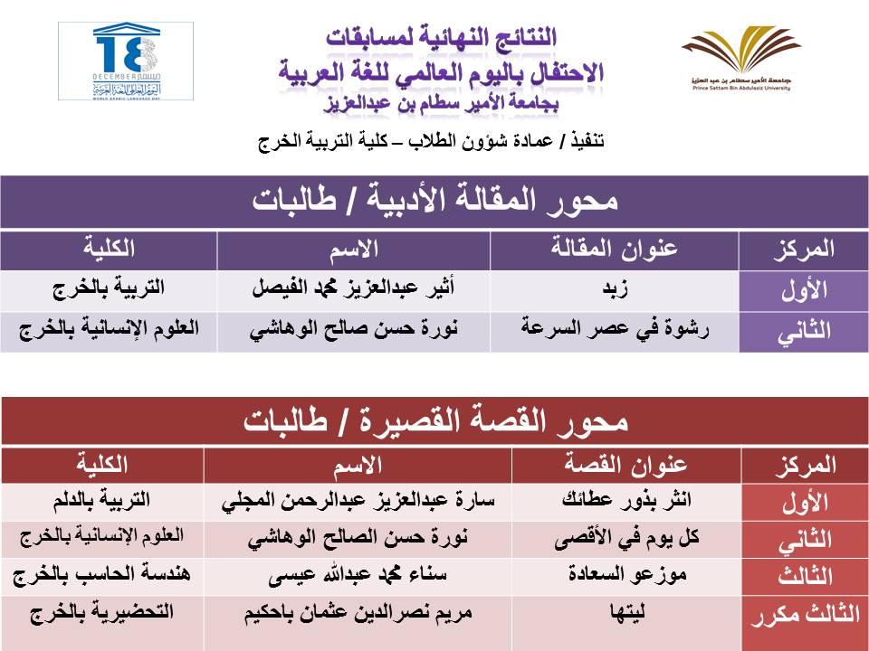 وللطالبات وانتهت بفوز قصة (انثر بذور عطائك) للطالبة سارة عبد العزيز عبد الرحمن المجلي من تربية الدلم بالمركز الأول، وفي المركز الثاني فازت قصة (كل يوم في الأقصى) للطالبة نورة حسن الصالح الوهاشي من كلية العلوم والدراسات الإنسانية بالخرج، وفي المركز الثالث فازت قصة (موزعو السعادة) للطالبة سناء محمد عبد الله عيسى من هندسة الحاسب، وفي المركز الرابع فازت قصة (ليتها..) للطالبة مريم نصر الدين عثمان باحكيم من عمادة السنة التحضيرية.