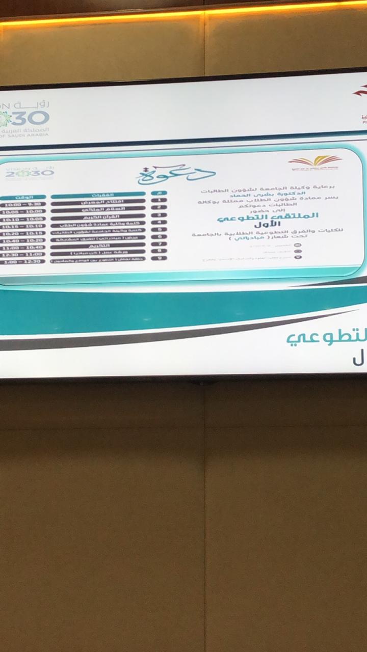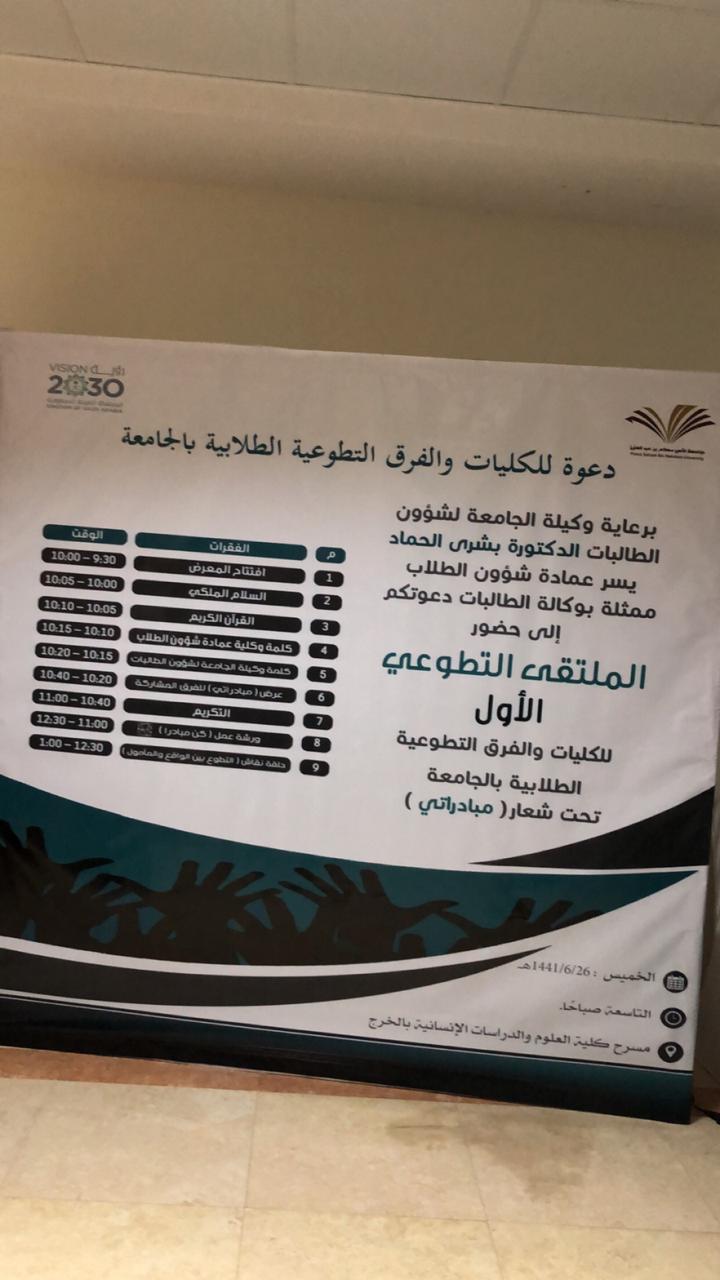 رعاية وكيلة الجامعة لشؤون الطالبات، الدكتورة بشرى الحماد، نظّمت وكالة الطالبات بعمادة شؤون الطلاب المعرض والملتقى التطوّعي الأول للكليات والفرق الطلابية بالجامعة، الذي حمل شعار "مبادراتي".