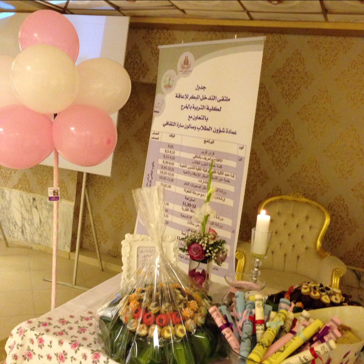في إطار تشجيعها للفعاليات التخصصية واستمرارا لتكريسها للدور الطلابي في الأنشطة الطلابية وتطويرها ، افتتحت وكيلة عمادة شؤون الطلاب ملتقى التدخل المبكر للإعاقات اليوم الأحد ١٥-٢-١٤٣٦ بفندق شمسة والذي أعدته كلية التربية بالخرج برعاية تنظيمية من القسم النسائي بعمادة شؤون الطلاب ودعم من صالون سارة الثقافي .