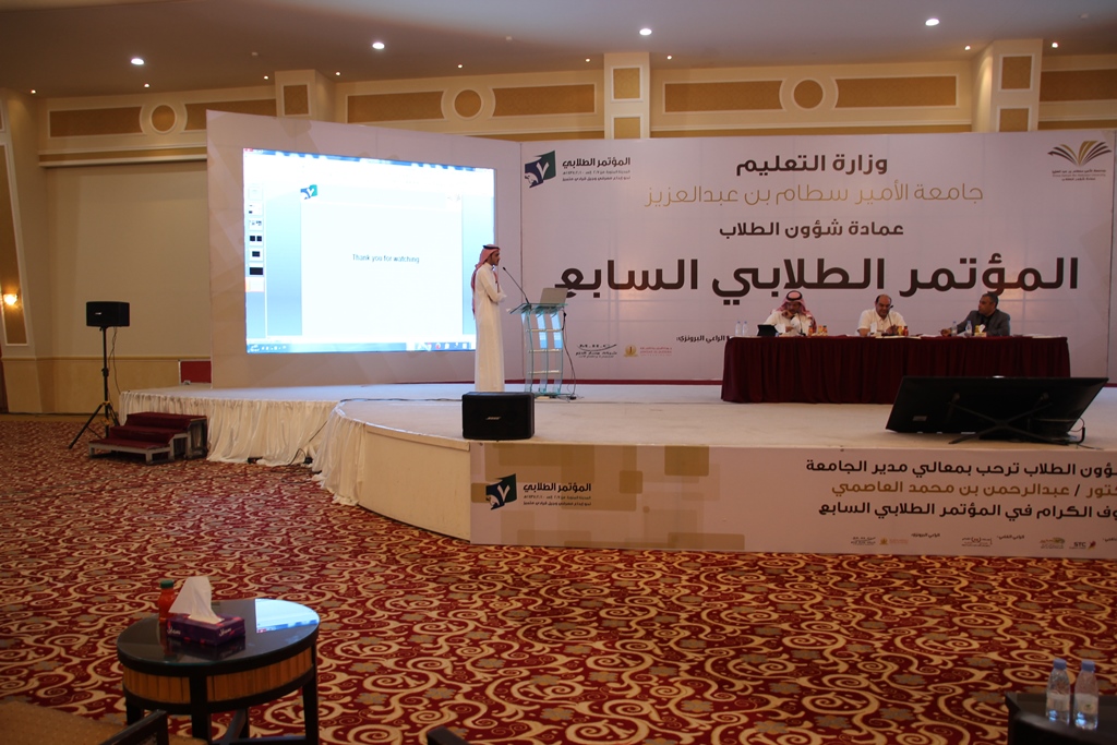 برعاية معالي مدير جامعة الأمير سطّام بن عبدالعزيز الدكتور عبدالرحمن بن محمد العاصمي وبحضور عميد شؤون الطلاب الدكتور مسفر الكبيري انطلقت فعاليات المؤتمر العلمي السابع لطلاب وطالبات التعليم والتي تنظمهاعمادة شؤون الطلاب بقاعة القصر للاحتفالات والمؤتمرات بالخرج .