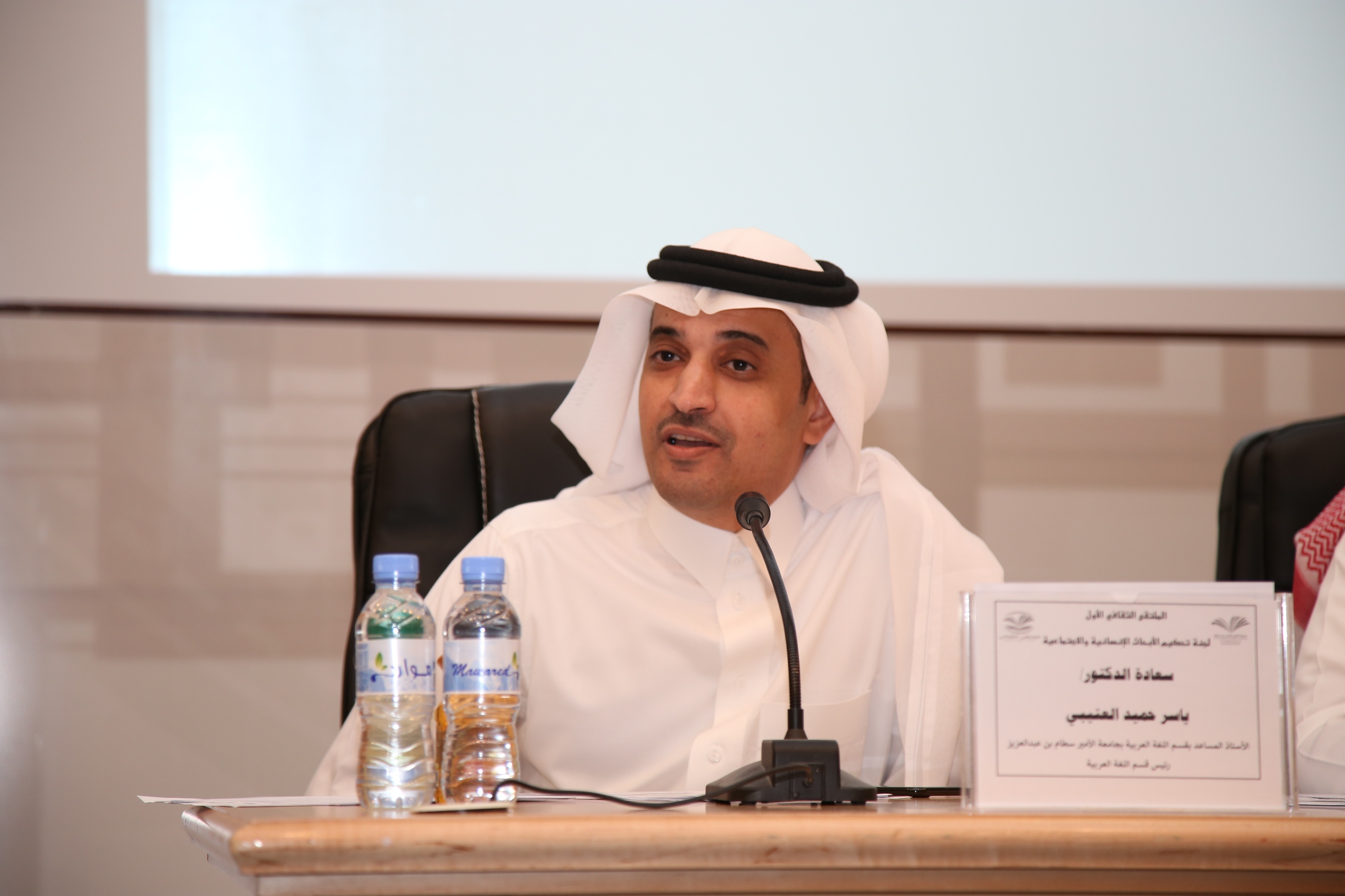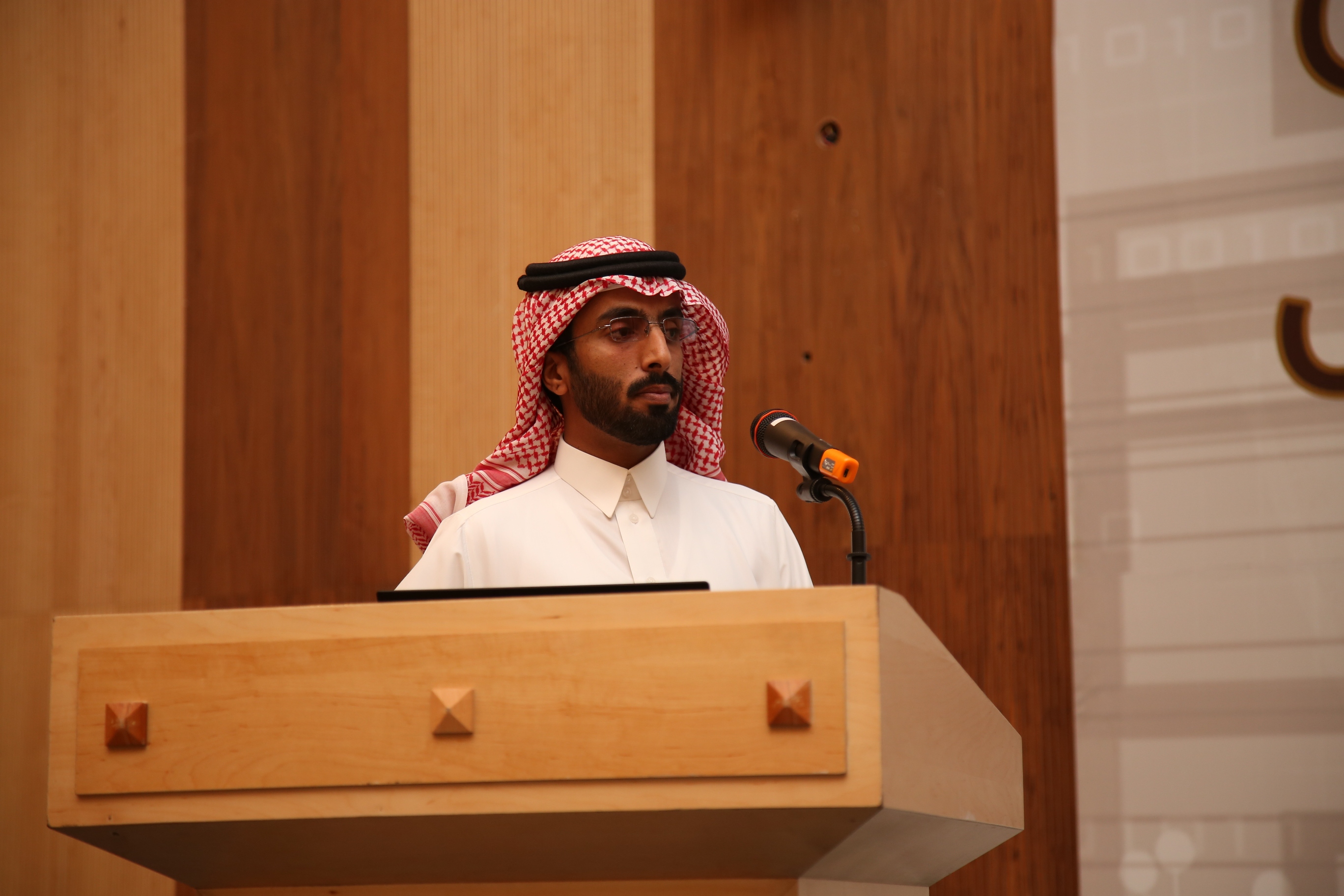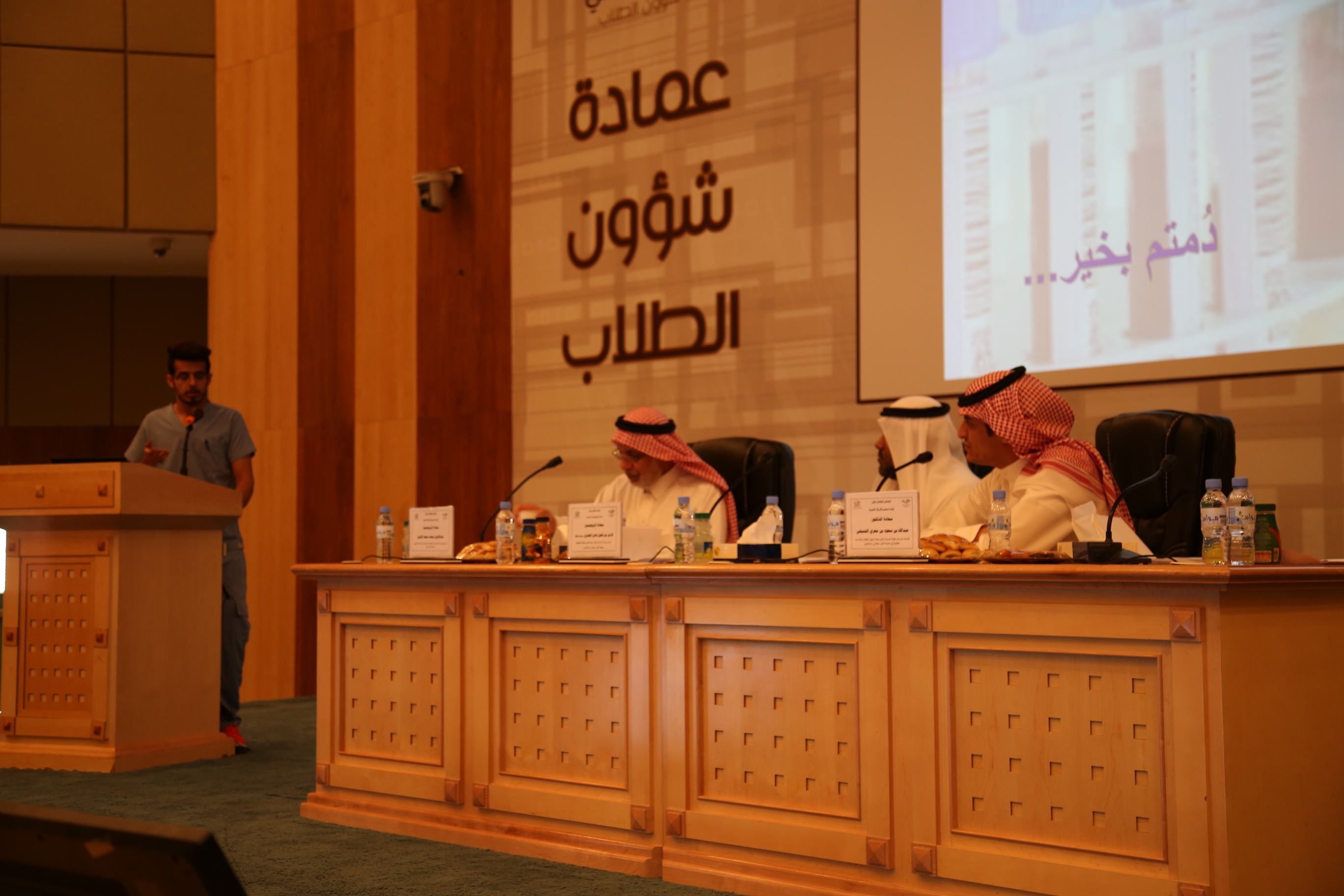بعد الانتهاء من عرض الأبحاث المشاركة في محور الأبحاث الإنسانية والاجتماعية , ألقاء عميد شؤون الطلاب الدكتور ثلاب بن عبدالله الشكرة كلمة رحب فيها بالحضور والطلاب المشاركين في الملتقى , حيث ذكر سعادته بأن عمادة شؤون الطلاب تحرص دائماً على أتاحت الفرصة لأبنائها الطلاب وتذليل الصعاب والمعوقات للبحث والتفكير للخروج بأبحاث نافعة ومشاريع مجتمعية هادفة , وكذلك تحرص على فتح المجال بين الطلاب للتنافس لإظهار ما لديهم من مواهب , وفي نهاية حديثه قدم د. ثلاب شكره للكليات المشاركة في فعاليات الملتقى وعلى تعاونهم لإنجاح هذه التظاهرة .