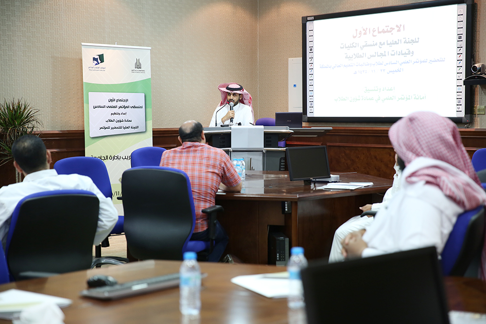 حيث استهل الاجتماع بكلمة لعميد شؤون الطلاب الدكتور مسفر الكبيري رحب فيها بالحضور، واستفتح بكلمته أعمال وبرامج المؤتمر العلمي السادس، واستعرض في حديثه الانجازات التي حققتها الجامعة في المؤتمر العلمي الخامس , ثم قدم نبذه عن شروط وضوابط المؤتمر العلمي السادس وتوجيهات وزارة التعليم العالي، مشيراً إلى بعض الترتيبات الجديدة لمؤتمر هذا العام, كما حث سعادته المنسقين على العمل بجديه والتعاون والتواصل مع العمادة لكي يحقق طلاب جامعة سلمان مراكز متقدمة في كافة المحاور والفعاليات المصاحبة للمؤتمر.