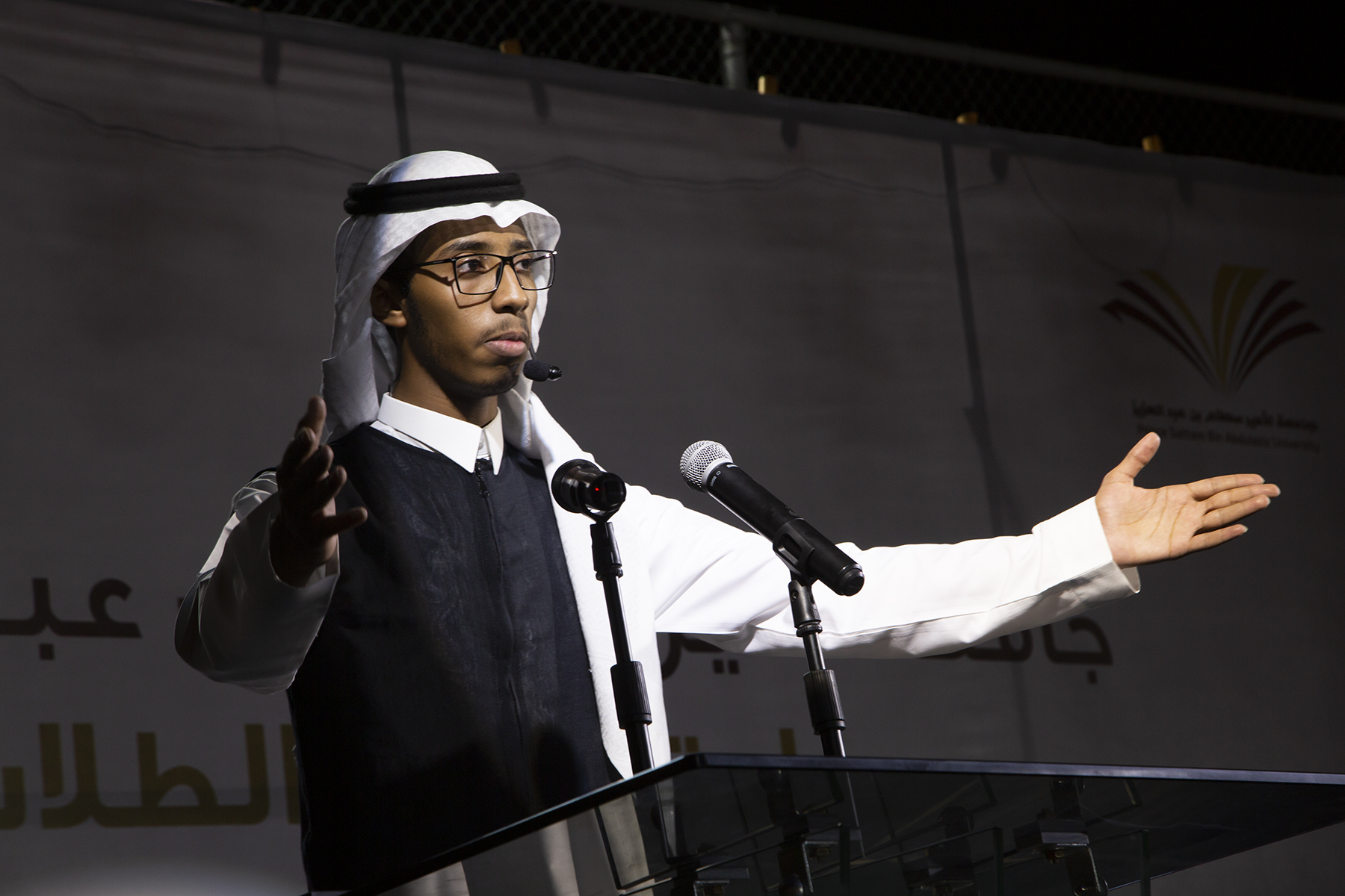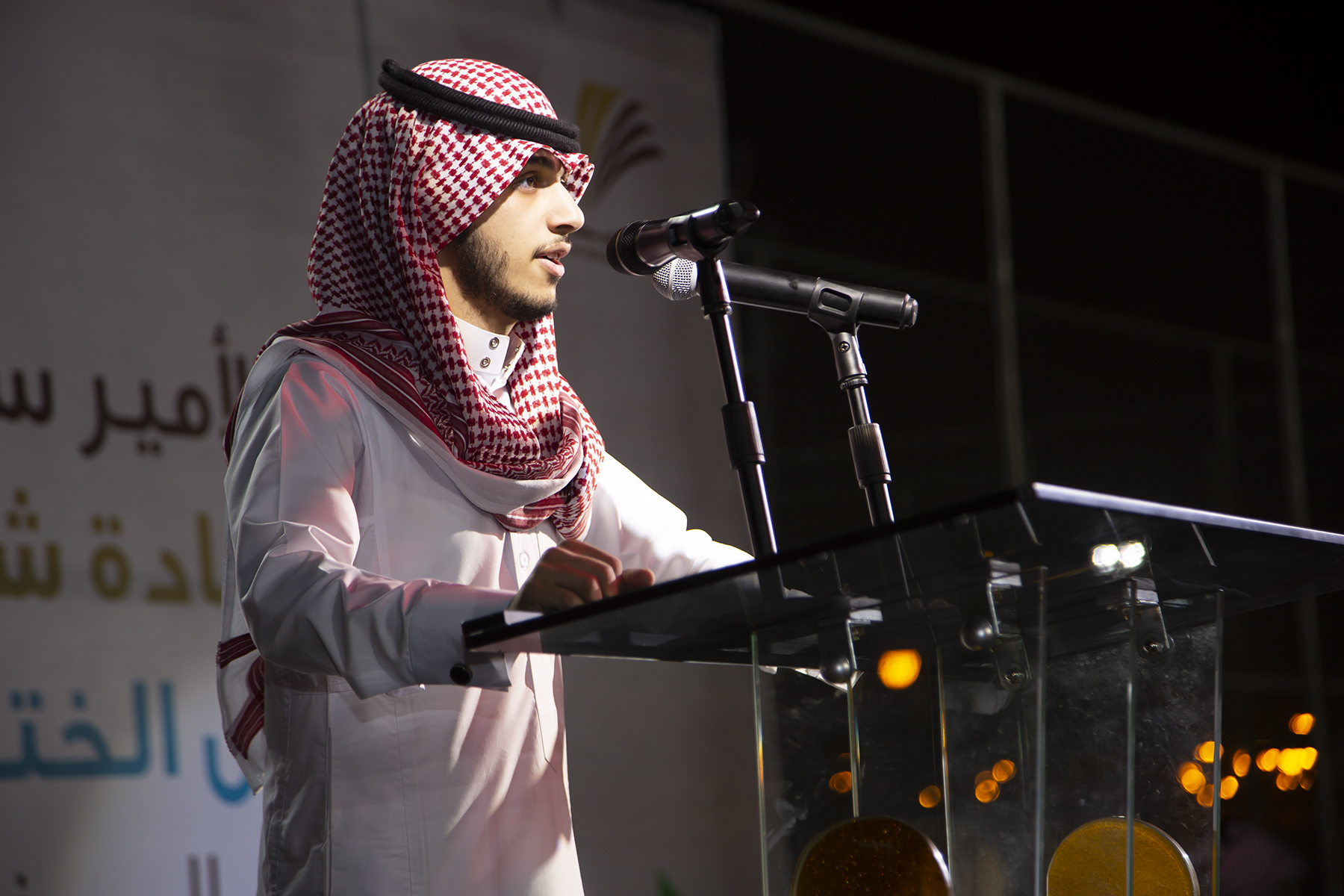بدء الحفل بآيات من الذكر الحكيم تلاها عبدالمجيد الشدي , بعد ذلك ألقى عميد شؤون الطلاب الدكتور ثلاب بن عبدالله الشكرة كلمة بهذه المناسبة رحب فيها بالضيوف الحضور , وذكر بأني مسرور بما رأيته من برامج وأنشطة نفذت خلال الملتقى الصيفي والتي كانت من تخطيط وتنفيذ أبنائنا الطلاب , والذي لا شك بأنه يحقق السقف الأعلى في بناء شخصية الطالب , والتي تكمن في ممارسته لما يخططه وينفذه هو بنفسه.