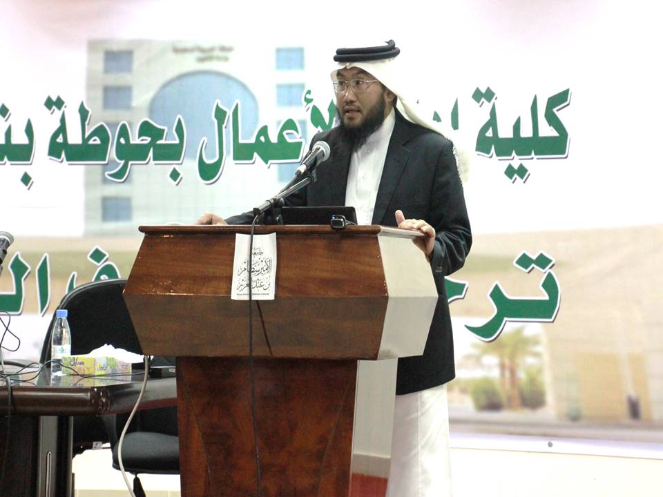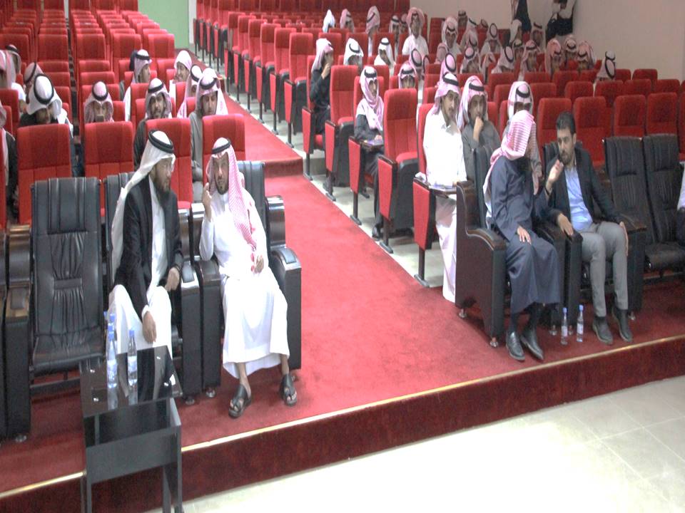 افتتح اللقاء عميد الكلية بكلمة رحب فيها بوفد عمادة شؤون الطلاب وعلى رأسهم أمين المؤتمر العلمي الدكتور/ عمر بن محمد دين، ورافقه من العمادة الأستاذ/ شبيب السبيعي، والأستاذ/ سلطان العنزي، وذكر الدكتور خالد في كلمته أن مثل هذه المؤتمرات نافعة جدًّا في تطوير مواهب الطلاب، ورفع مستواهم العلمي والثقافي والمهاري، وحثَّهم على المشاركة فيه.