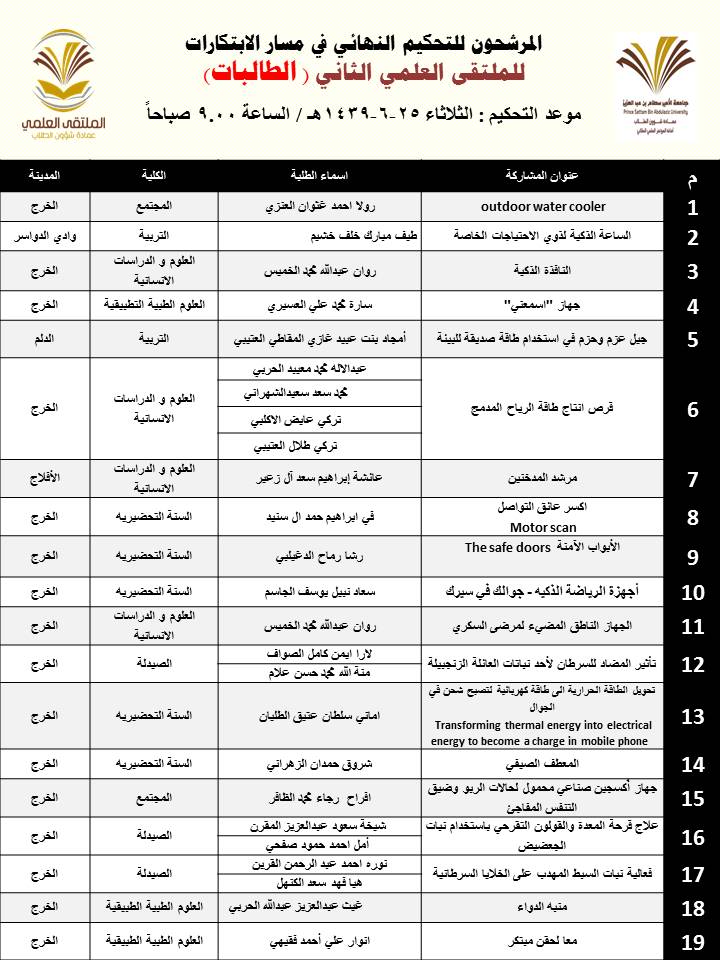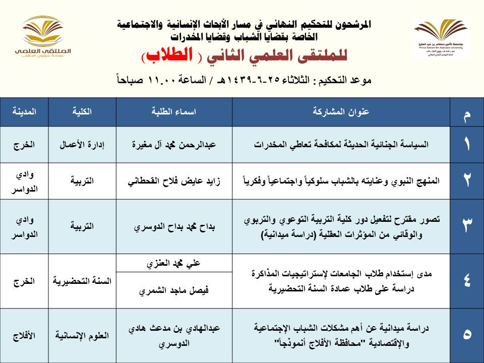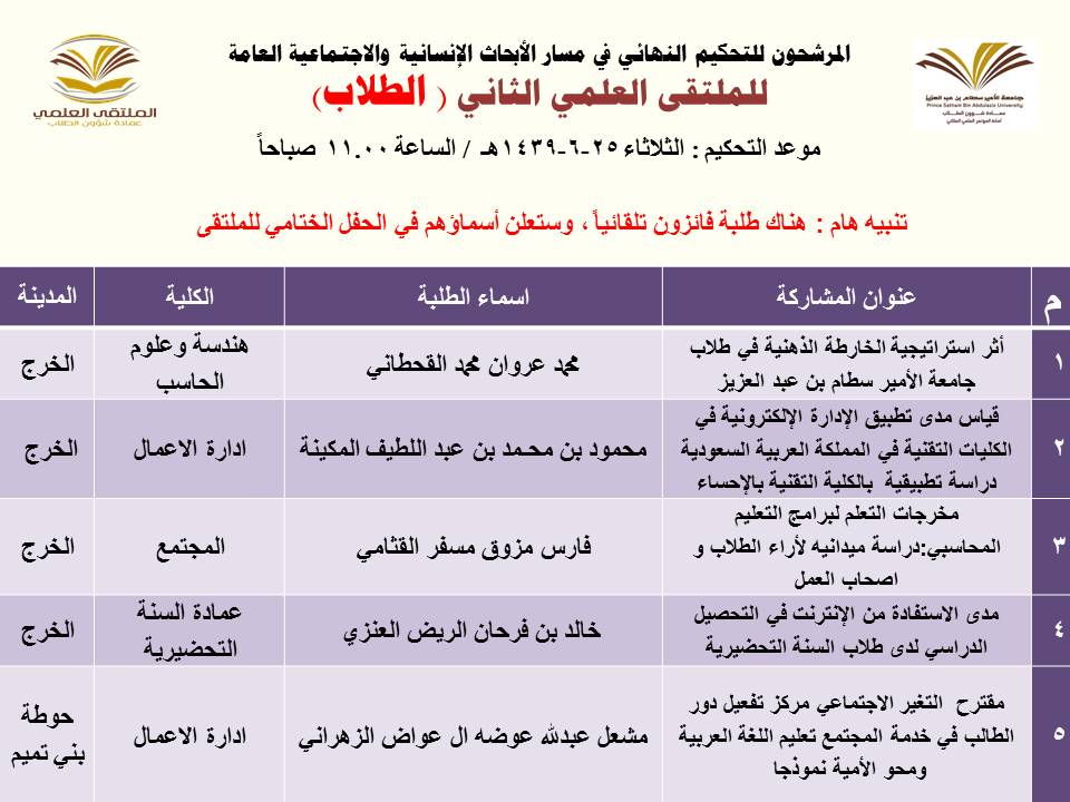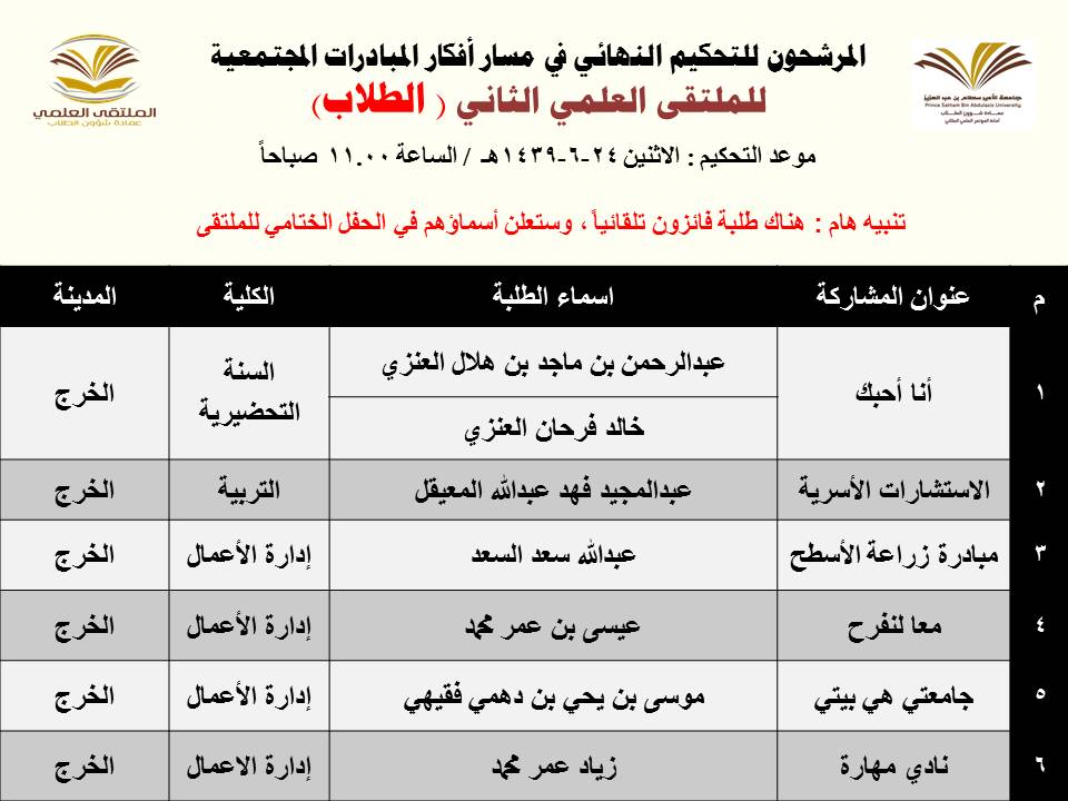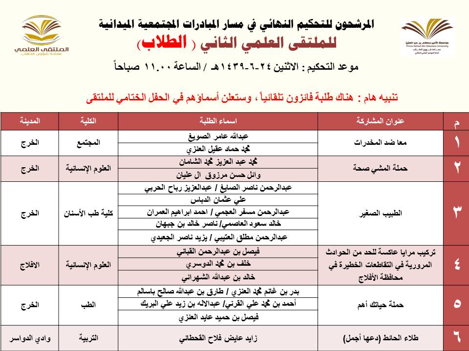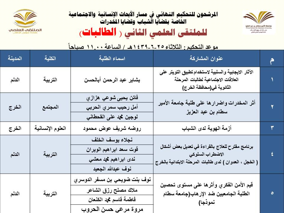 أعلنت عمادة شؤون الطلاب عن المشاركات المرشحة للتحكيم النهائي في الملتقى العلمي الثاني الذي تنظمه العمادة خلال الفترة 23 – 27 / 6 / 1439هـ بمسرح أدارة الجامعة (كلية الطب مبنى6) بالمدينة الجامعية بمحافظة الخرج للطلاب , ومسرح مبنى الهداية للطالبات, وهي كالتالي: