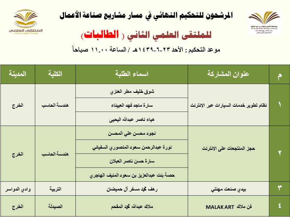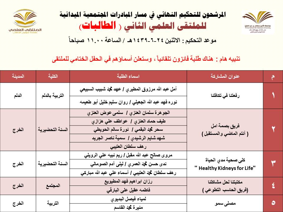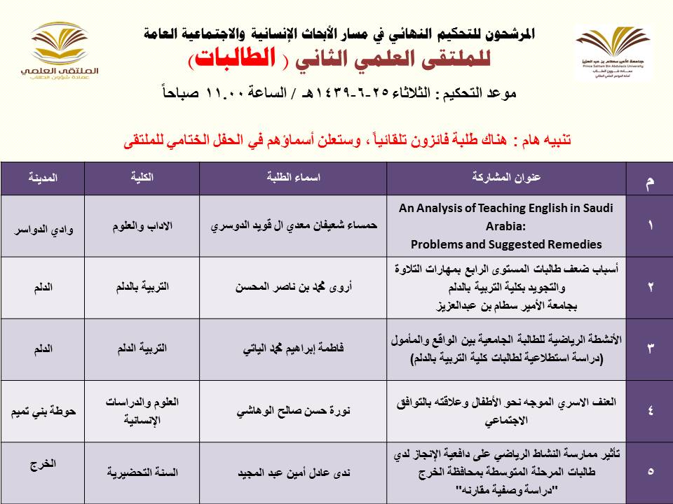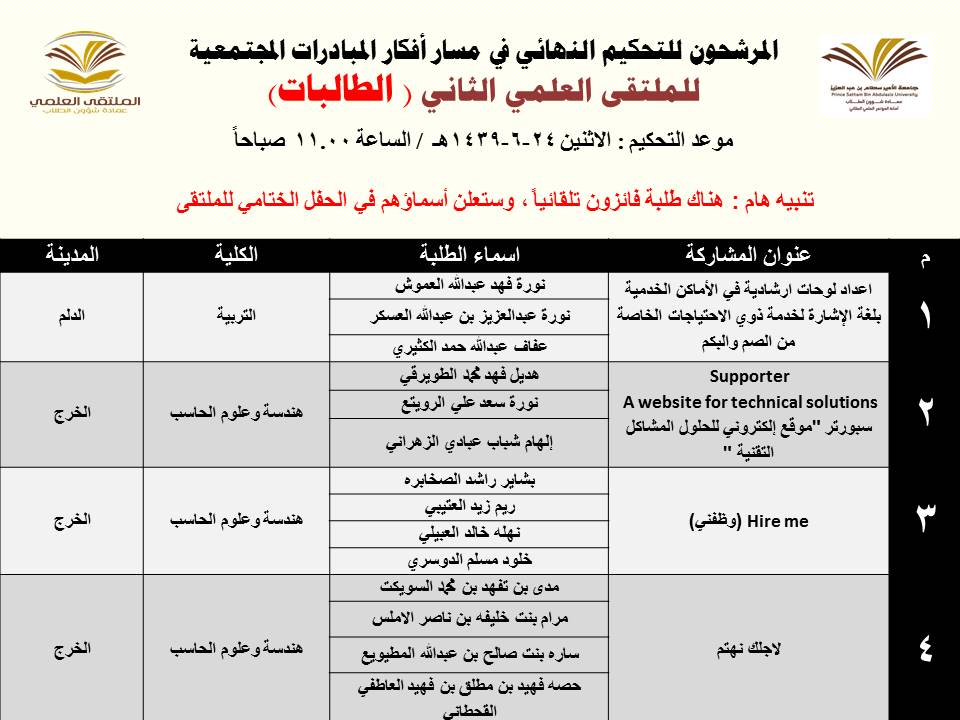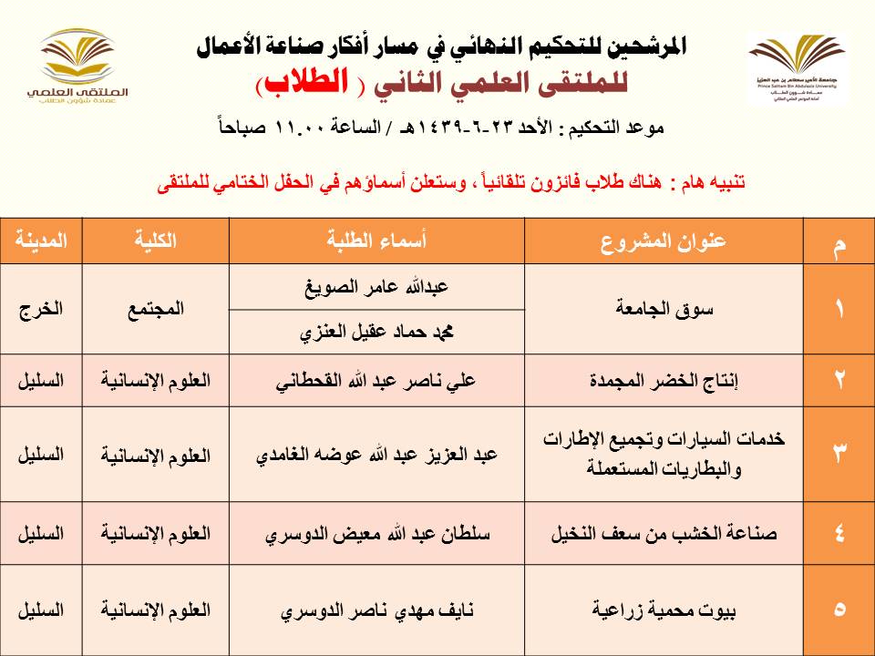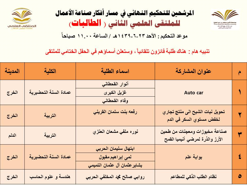 أعلنت عمادة شؤون الطلاب عن المشاركات المرشحة للتحكيم النهائي في الملتقى العلمي الثاني الذي تنظمه العمادة خلال الفترة 23 – 27 / 6 / 1439هـ بمسرح أدارة الجامعة (كلية الطب مبنى6) بالمدينة الجامعية بمحافظة الخرج للطلاب , ومسرح مبنى الهداية للطالبات, وهي كالتالي:
