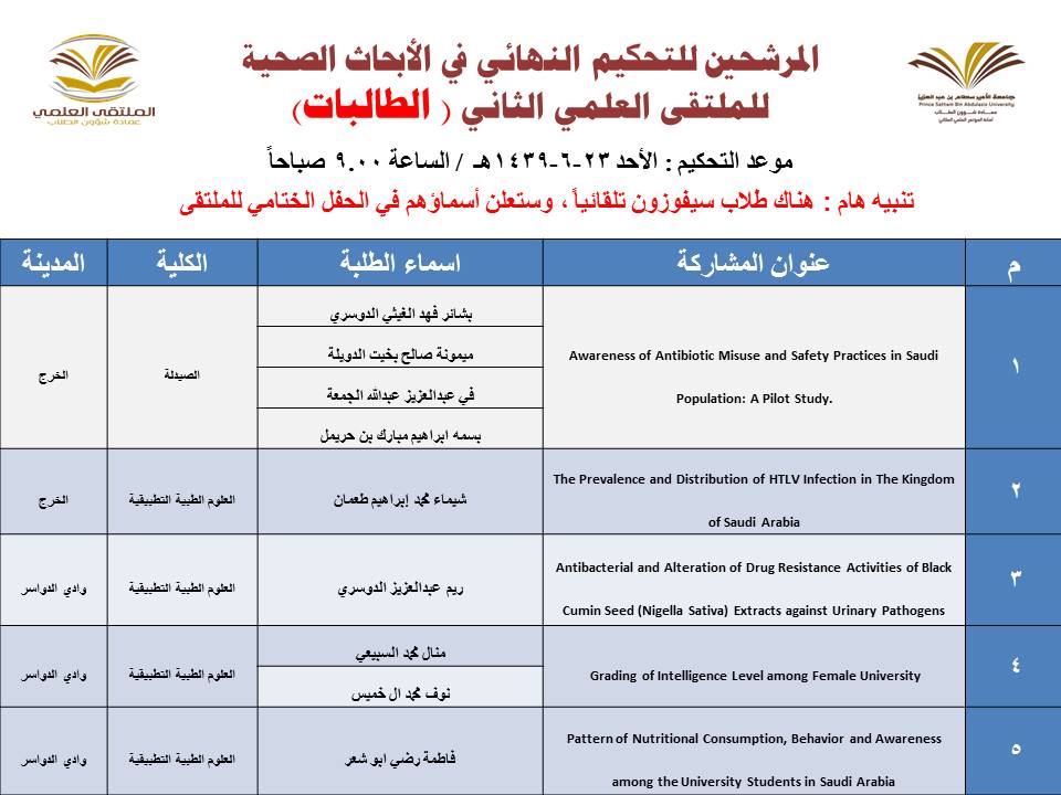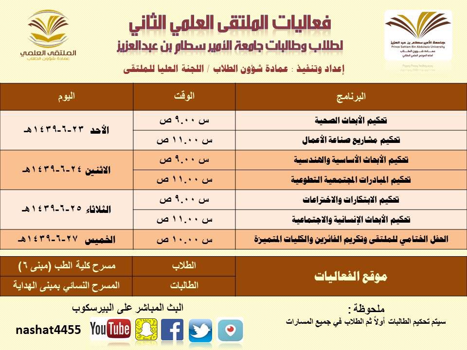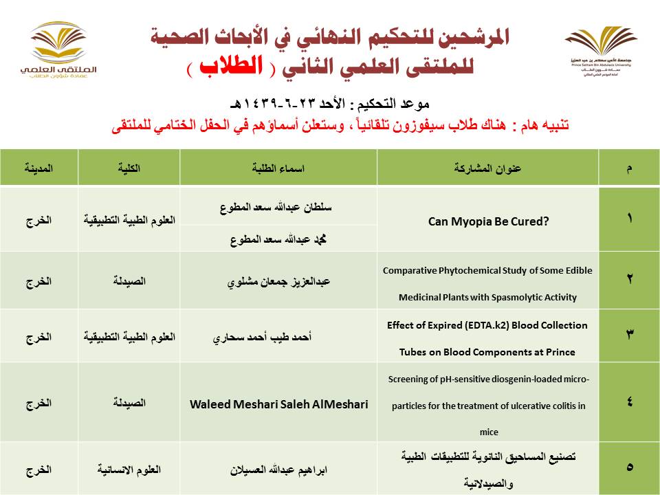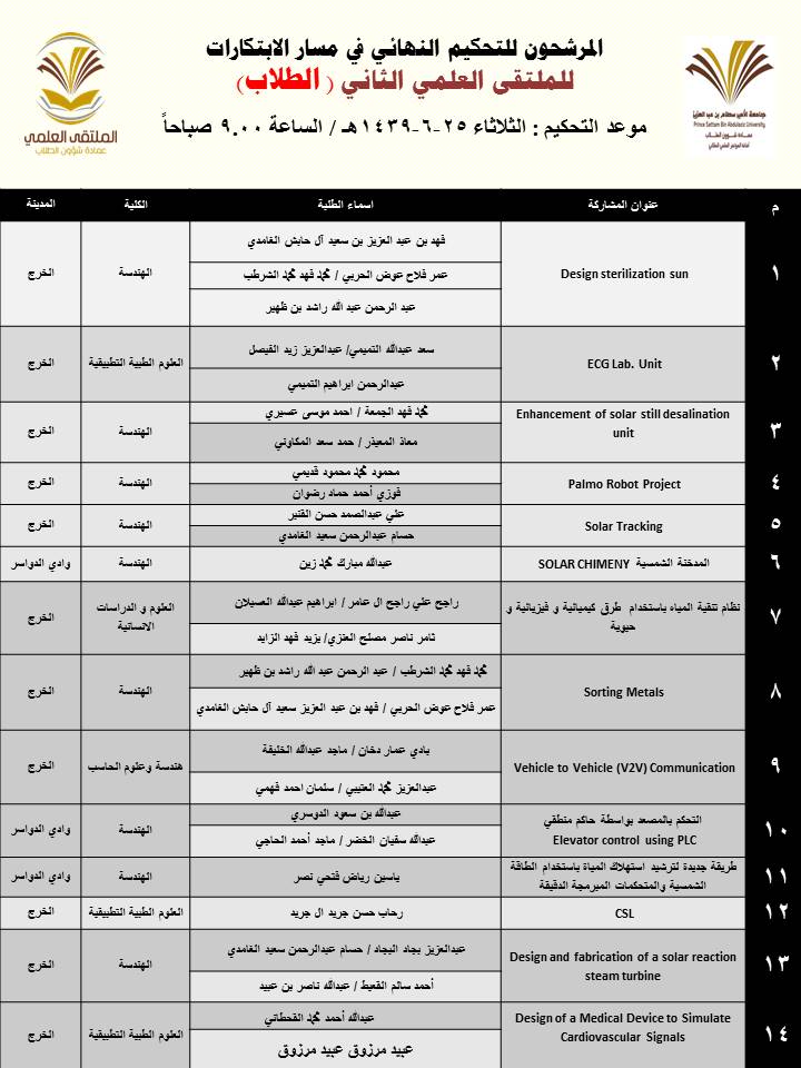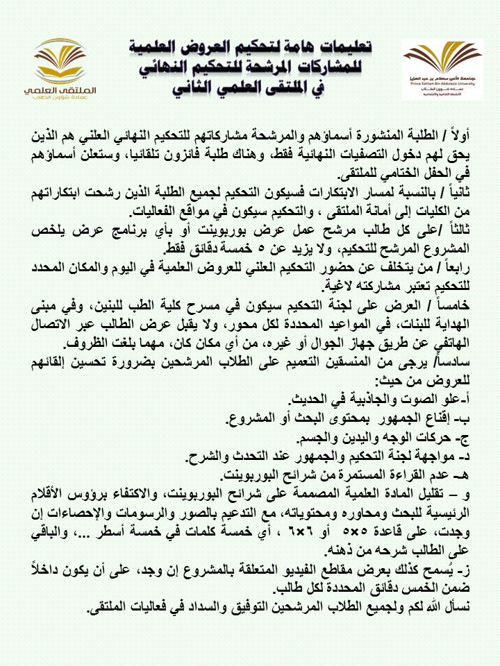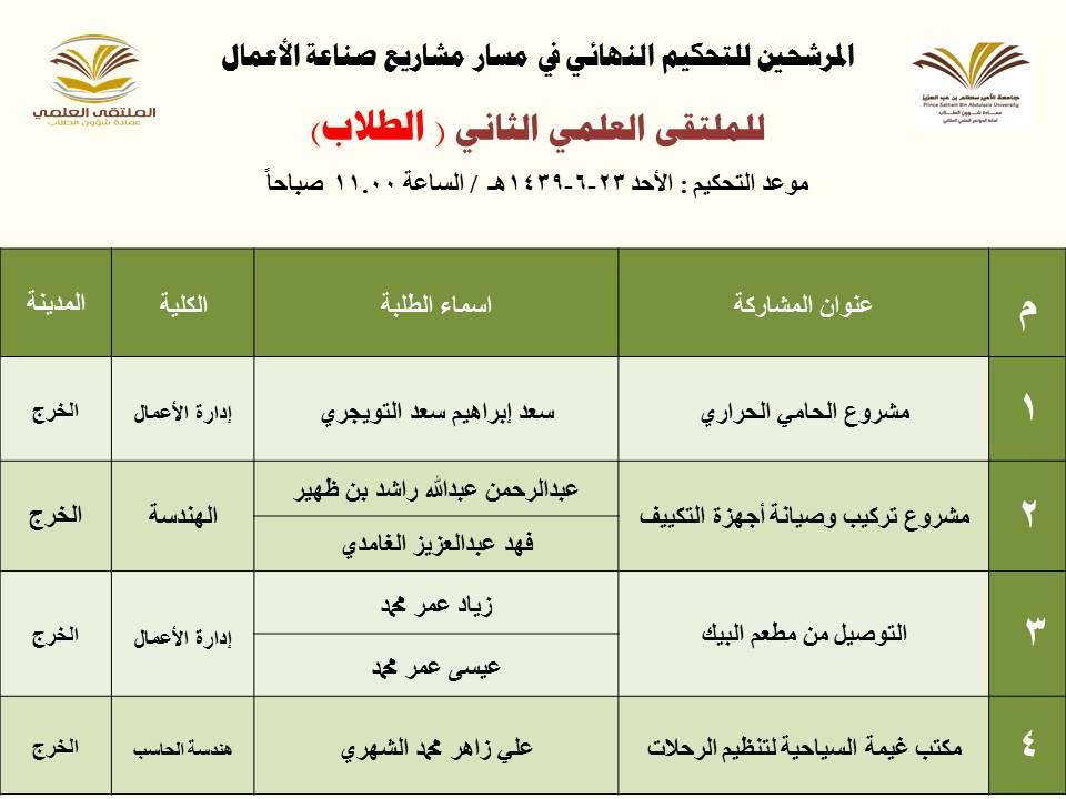 أعلنت عمادة شؤون الطلاب عن المشاركات المرشحة للتحكيم النهائي في الملتقى العلمي الثاني الذي تنظمه العمادة خلال الفترة 23 – 27 / 6 / 1439هـ بمسرح أدارة الجامعة (كلية الطب مبنى6) بالمدينة الجامعية بمحافظة الخرج للطلاب , ومسرح مبنى الهداية للطالبات, وهي كالتالي:
