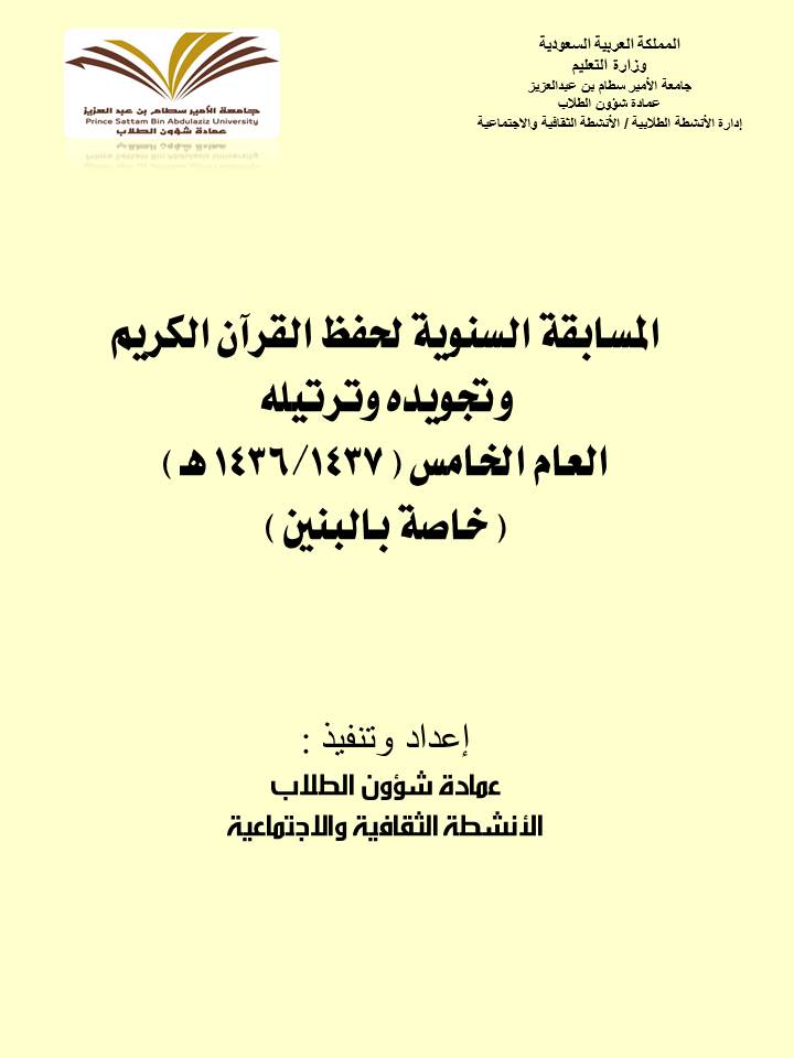 تعلن إدارة الأنشطة الثقافية والاجتماعية بعمادة شؤون الطلاب عن إقامة المسابقة السنوية لحفظ القرآن الكريم وتجويده وترتيله، للعام الخامس، والخاصة بالبنين، وذلك ضمن الأنشطة والفعاليات الثقافية التي تقيمها العمادة في هذا العام، وذلك انطلاقاً من منهجها في حث الطلاب على تعاهد هذا الكتاب تلاوة وحفظاً وتدبراً وعملاً ودعوة إليه، حيث أتاحت العمادة في هذه المسابقة أربعة فروع، وهي: كامل القرآن، وخمسة عشر جزءاً، وعشرة أجزاء، وخمسة أجزاء، وسيكون الاختبار يومي الأحد والاثنين الموافق 26-27/5/1437هـ، وسيحدد المكان في وقت لاحق.
