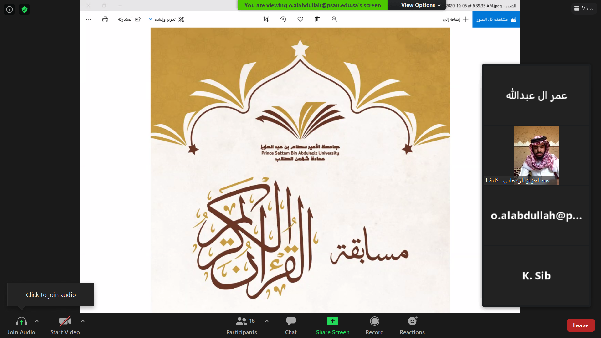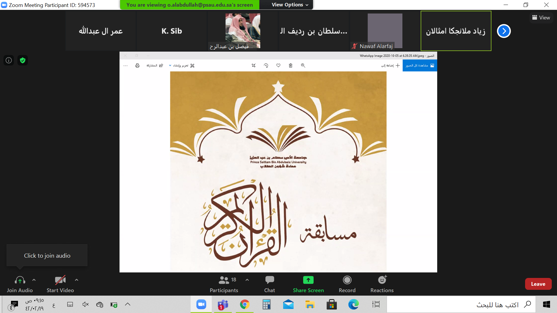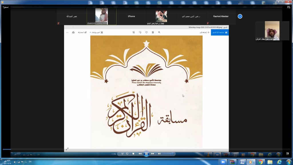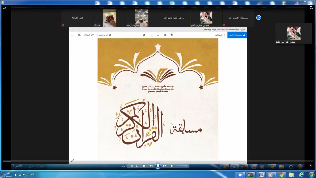 حكمت عمادة شؤون الطلاب المشاركات الطلابية من مختلف كليات الجامعة (بنين) المشاركة في مسابقة القرآن الكريم خلال يومي الأثنين والثلاثاء الموافق 18 – 19 / 2/ 1442هـ عبر برنامج (زووم) , حيث تكونت لجنة التحكيم من الدكتور فيصل الشدي عضو هيئة التدريس بكلية التربة بالخرج والدكتور عبدالله الجمعان عضو هيئة التدريس بكلية التربة بالخرج والدكتور خير الدين سيب عضو هيئة التدريس بكلية التربة بالخرج.