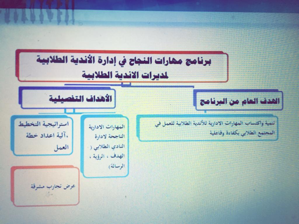 نظمت شعبة الأندية الطلابية بوكالة الطالبات بعمادة شؤون الطلاب برنامجاً تدريباً بعنوان (تنمية المهارات الإبداعية في إدارة الأنشطة والأندية الطلابية) وذلك يوم الأحد الموافق ١٣-٣-١٤٤١ البرنامج من تقديم المدربة نجد الدوسري حيث يهدف البرنامج إلى تنمية المهارات الإدارية لمديرات ونائبات الأندية الطلابية للعمل في المجتمع الطلابي باحترافية وكفاءة عالية اشتمل البرنامج على عدة محاور رئيسة منها ؛ التعريف بماهية النادي الطلابي وأهدافه ومهام مديرة وأعضاء النادي وأهم المهارات الإدارية الناجحة اللازمة لإدارة النادي الطلابي واستراتيجية التخطيط وتنفيذها وتقويمها وكذلك التعرف على آلية إعداد خطة العمل وتوزيع المهام وفن كتابة التقارير والخطابات وقد صاحب الدورة التدريبية تطبيق عملي لكافة محاور البرنامج من قبل المشاركات .