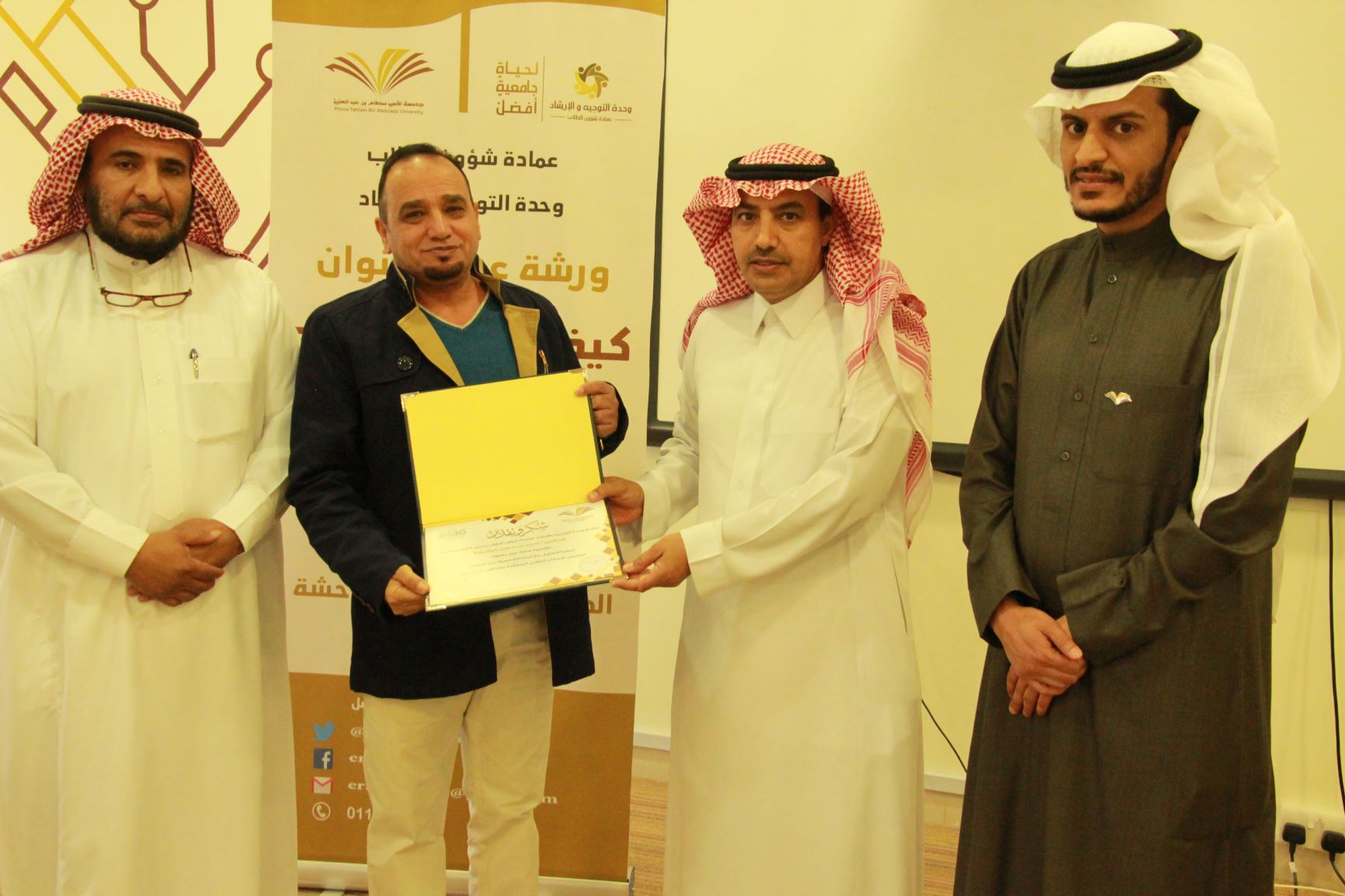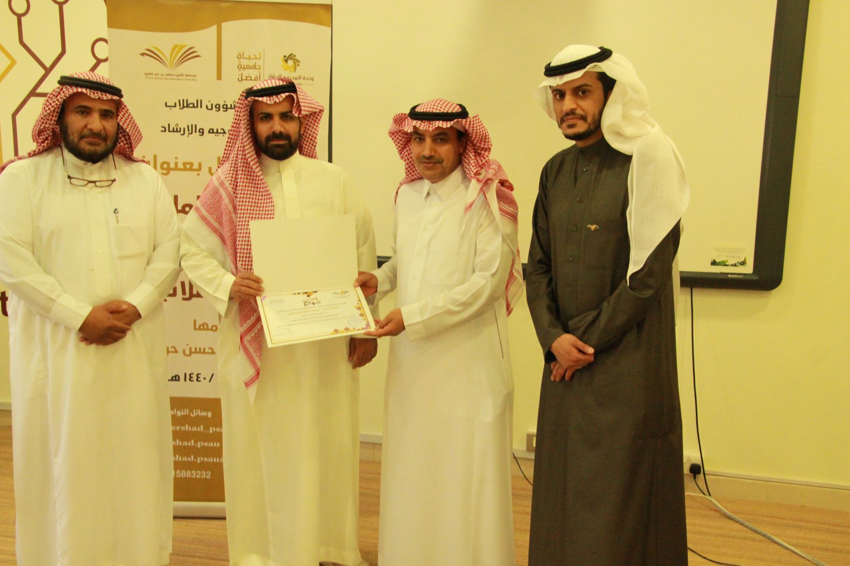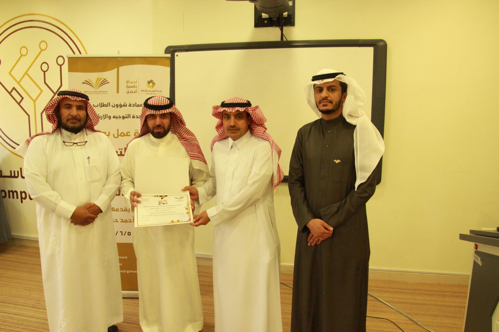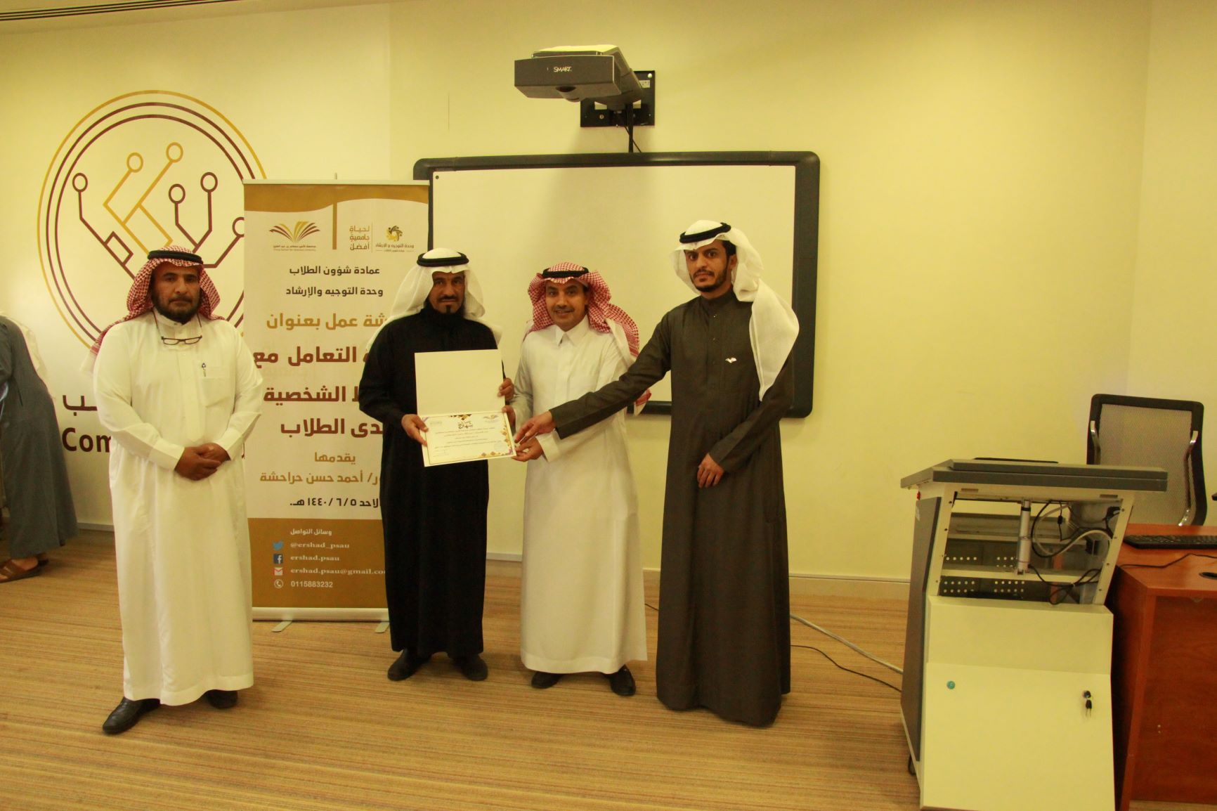بحضور عميد شؤون الطلاب الدكتور ثلاب بن عبدالله الشكره ووكيل عمادة شؤون الطلاب للخدمات الطلابية والإسكان الدكتور عبدالله بن سعود الشتيلي أقامت وحدة التوجيه والإرشاد بعمادة شؤون الطلاب اليوم الأحد 5 / 6 / 1440هـ دورة بعنوان " "كيفية التعامل مع أنماط الشخصية لدى الطلاب" لمشرفي الإسكان الطلابي , وذلك بنادي الحاسب في كلية هندسة وعلوم الحاسب , قدمها الدكتور أحمد حراحشة.