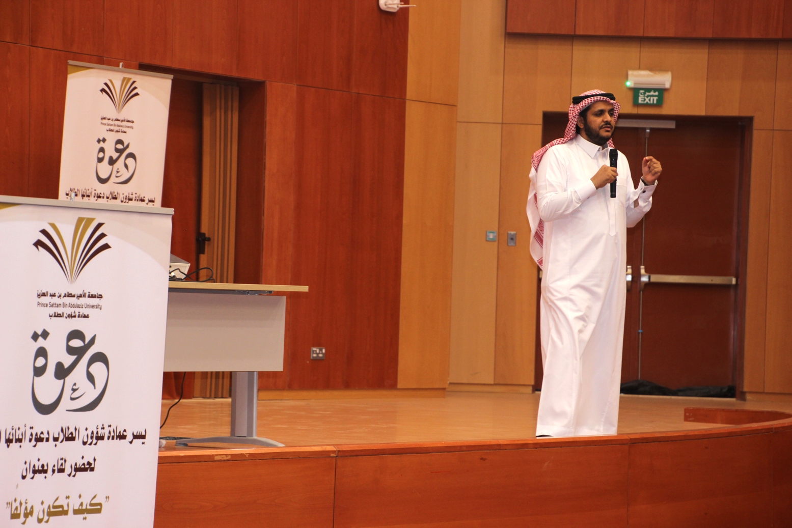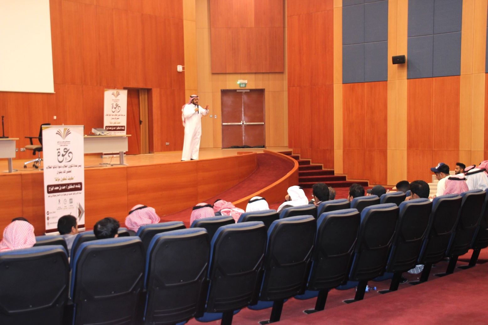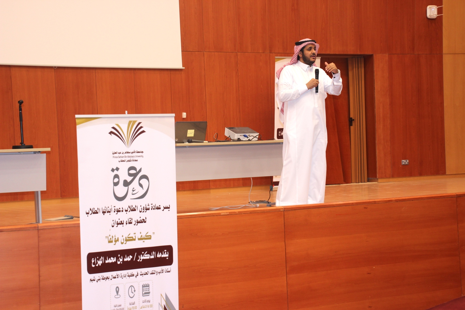 نظمت وحدة الأنشطة الثقافية والاجتماعية بعمادة شؤون الطلاب صباح اليوم الأحد 22 / 6 / 1441هـ بمسرح كلية إدارة الأعمال بالخرج لقاء بعنوان "كيف تكون مؤلفاً" قدمه الدكتور حمد بن محمد الهزاع عضو هيئة التدريس بكلية إدارة الأعمال بحوطة بني تميم.