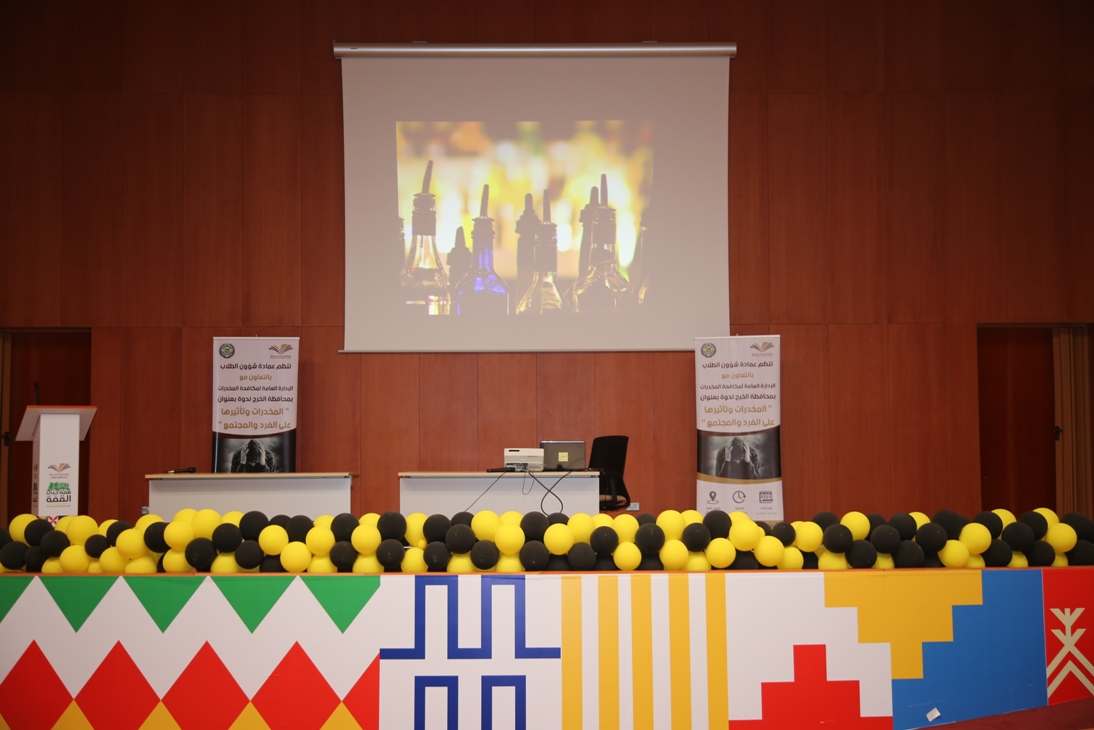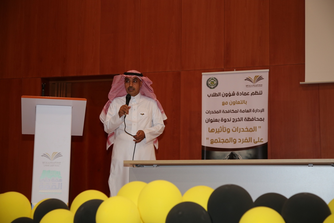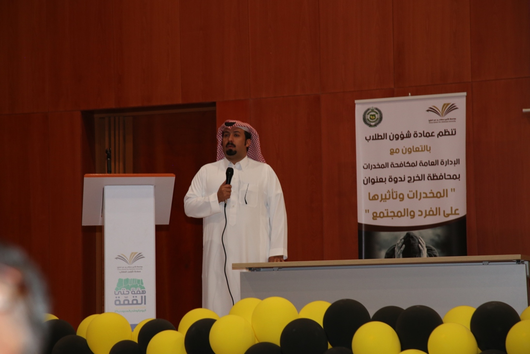 دشن عميد شؤون الطلاب الدكتور ثلاب بن عبدالله الشكرة صباح اليوم الأحد 20/11/1441هـ أولى برامج لجنة العمل المشترك مع المديرية العامة لمكافحة المخدرات في الجوانب التدريبية والتوعوية ومكافحة التدخين بالجامعة بندوة عنوانها "المخدرات وتأثيرها على الفرد والمجتمع" صحبها معرضاً توعوياً بكلية إدارة الأعمال بالخرج ,وذلك بالتعاون مع الإدارة العامة لمكافحة المخدرات في محافظة الخرج ممثلة بإدارة الشؤون الوقائية.