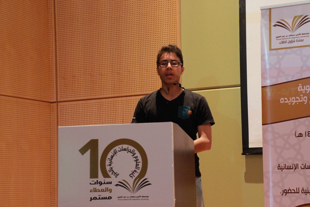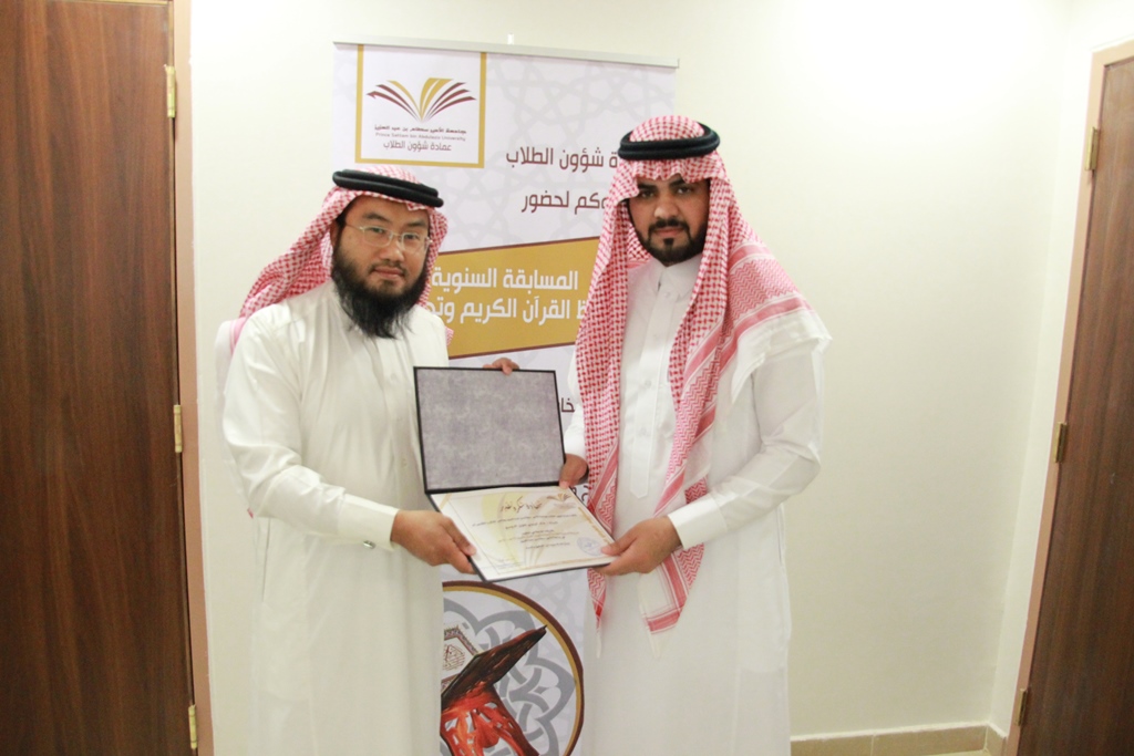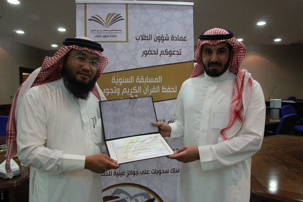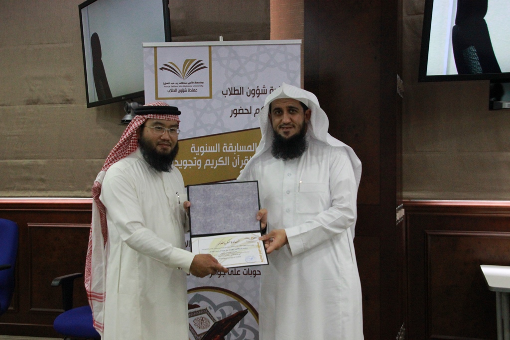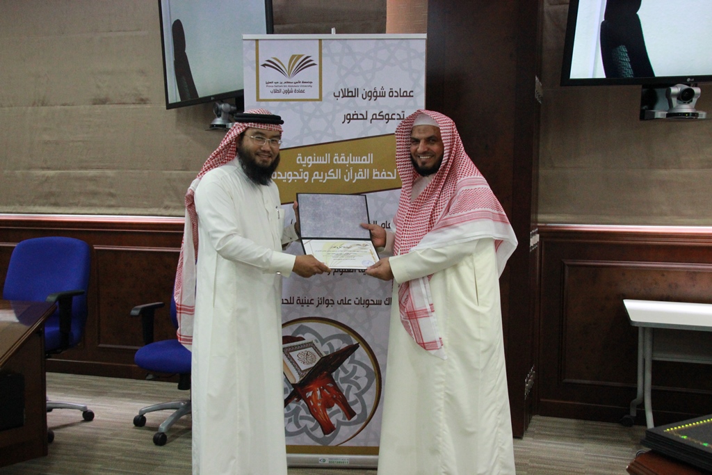 ضمن الفعاليات والبرامج الثقافية لعمادة شؤون الطلاب أقام قسم النشاط الثقافي والاجتماعي بالعمادة المسابقة السنوية لحفظ القرآن الكريم وتجويده وترتيله، للعام الخامس، والخاصة بالبنين، وذلك يوم الأحد والاثنين الموافق 25 ـــ 1437/5/26هـ، في مسرح كلية العلوم والدراسات الإنسانية بالخرج، وفي قاعة تدريب كبار الشخصيات بإدارة الجامعة، حيث خصص يوم الأحد لطلاب الخرج، ويوم الاثنين لطلاب وادي الدواسر عبر الشبكة الصوتية والمرئية بالجامعة.