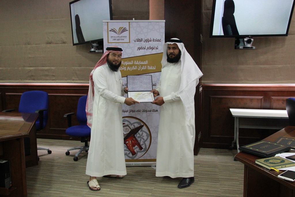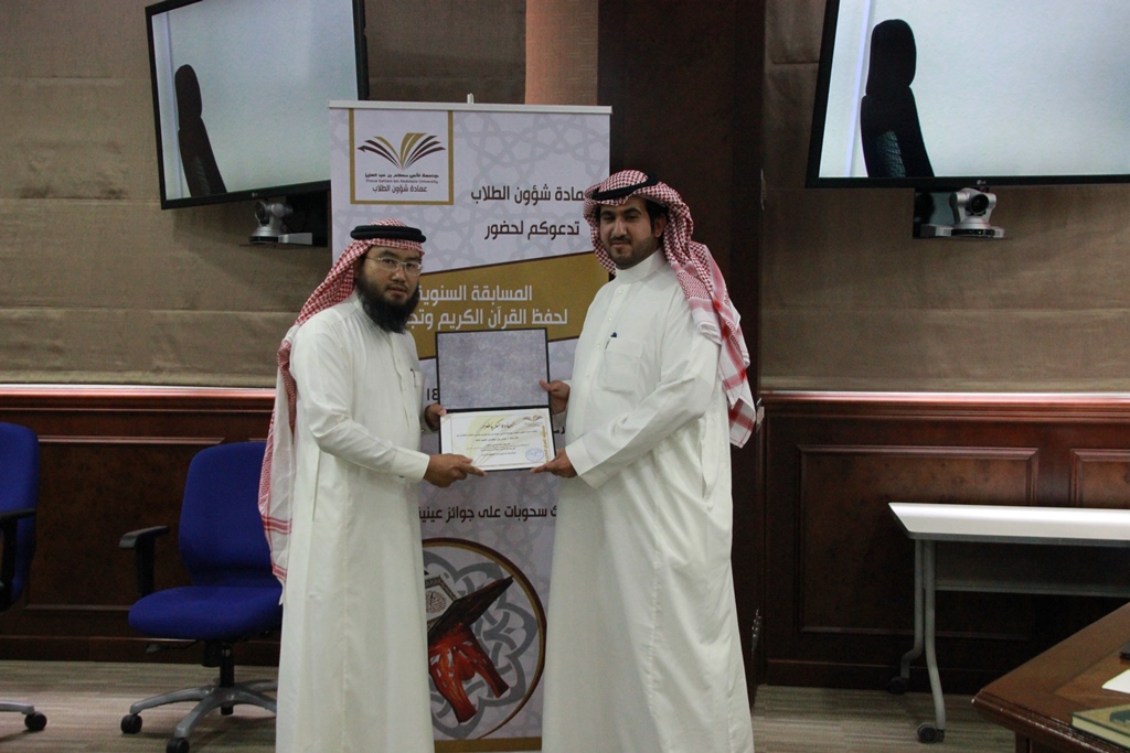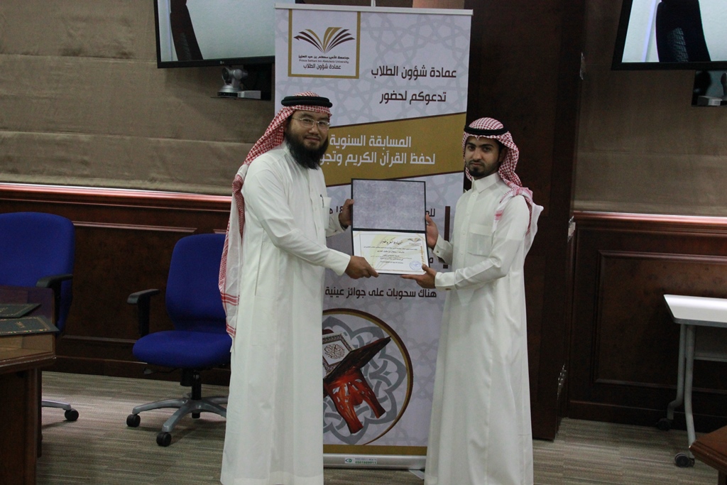 وتقدم لهذه المسابقة 20 عشرون طالباً من مختلف كليات الجامعة، وتكونت لجنة التحكيم من الدكتور/ عبدالرحمن بن عبيد الرفدي، وكيل كلية التربية للشؤون الإدارية والمالية، و الدكتور/ فيصل بن عبدالرحمن الشدي وكيل قسم الدراسات الإسلامية بكلية التربية، والدكتور/ عمر بن محمد دين المشرف على الأنشطة الثقافية والاجتماعية وأمين المؤتمر العلمي بعمادة شؤون الطلاب، وعضو هيئة التدريس بكلية التربية قسم اللغة العربية.