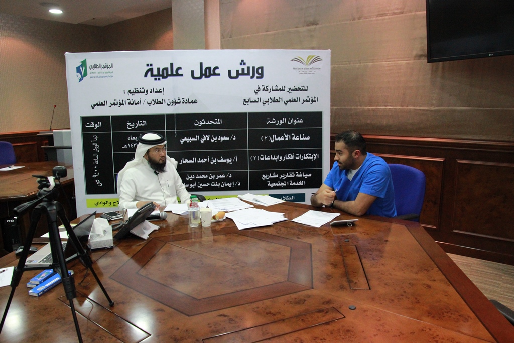 ضمن سلسلة الدورات التدريبية وورش العمل العلمية للتحضير للمشاركة في المؤتمر الطلابي السابع أقامت عمادة شؤون الطلاب في القسمين الرجالي والنسائي وأمانة المؤتمر العلمي ورشة عمل علمية بعنوان (صياغة تقارير مشاريع الخدمة المجتمعية) صباح يوم الأربعاء الموافق 22/5/1437هـ ، في قاعة تدريب كبار الشخصيات بإدارة الجامعة ، وتم الربط مع قاعة الهداية النسائية ، والقاعات الرجالية والنسائية في الحوطة ووادي الدواسر.