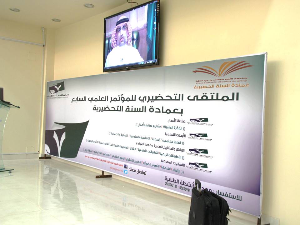 استضافت عمادة السنة التحضيرية أمين المؤتمر العلمي بعمادة شؤون الطلاب الدكتور/ عمر بن محمد دين لإقامة لقاء تعريفي عن المؤتمر العلمي الطلابي السابع، حضر اللقاء الدكتور/ أحمد العليوي وكيل عمادة السنة التحضيرية للشؤون الإدارية والمالية، ونظمه فريق العمل المكلف بإدارة شؤون المؤتمر بالسنة التحضيرية بقيادة الدكتور/ مسفر الهرش، وحضره كذلك مجموعة من أعضاء هيئة التدريس والموظفين وعدد كبير من الطلاب، وأقيم اللقاء في إحدى قاعات العرض، يوم الاثنين الموافق 15/4/1437هـ، عند الساعة العاشرة والنصف صباحاً.