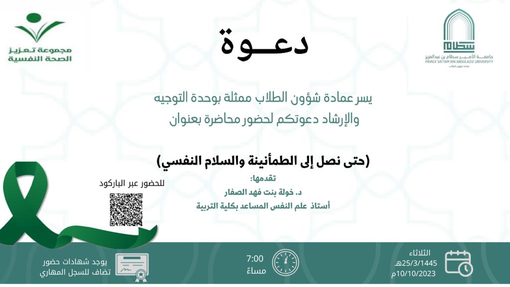 أقامت عمادة شؤون الطلاب ممثلة بوحدة التوجيه والإرشاد أول أمس الثلاثاء ١٤٤٥/٣/٢٥هـ الموافق ١٠ أكتوبر ٢٠٢٣م الساعة السابعة مساءً، محاضرة عن بعد بعنوان "حتى نصل إلى الطمأنينة والسلام النفسي"، وقدم الدورة الدكتورة خولة بنت فهد الصفار أستاذ علم النفس المساعد بكلية التربية بجامعة الأمير سطام بن عبدالعزيز.