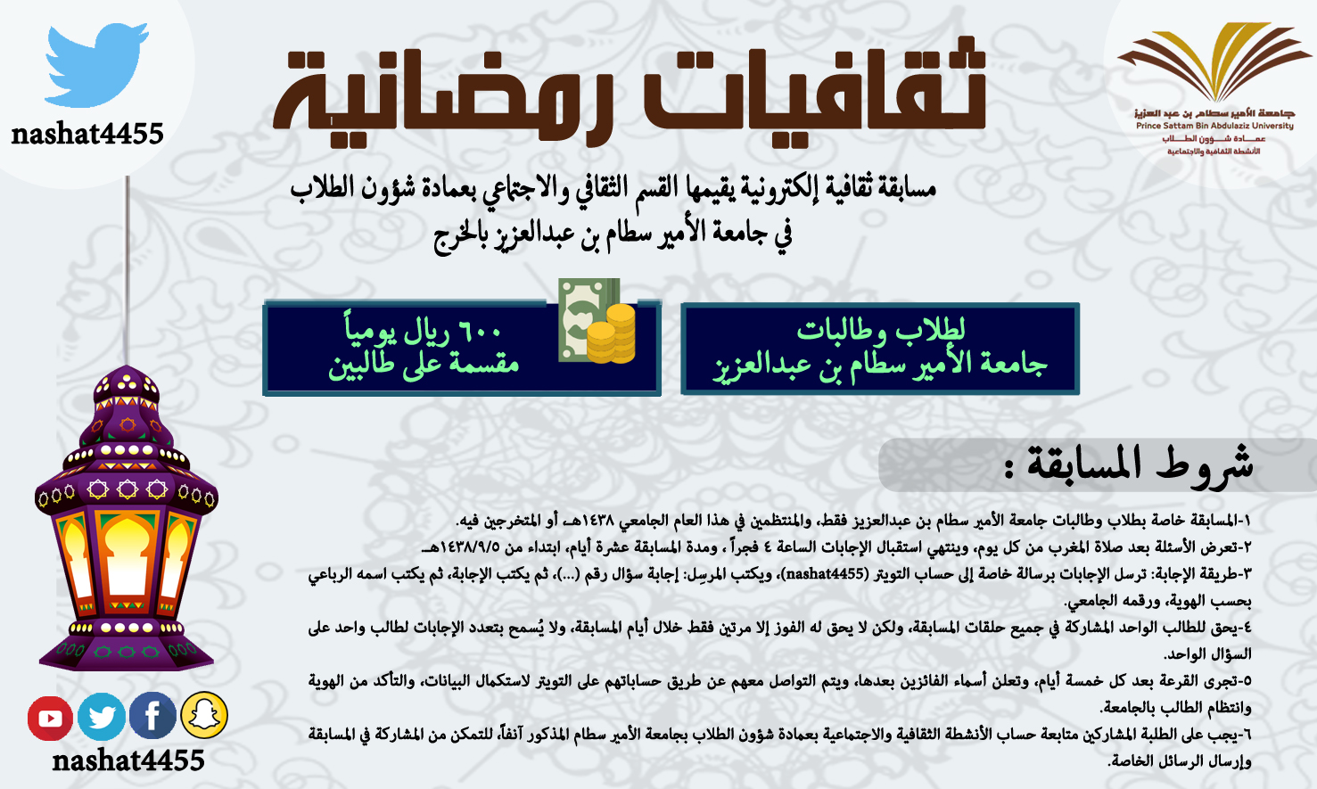 يسر عمادة شؤون الطلاب ممثلة في القسم الثقافي والاجتماعي أن تعلن عن إقامة مسابقة إلكترونية على موقع تويتر بعنوان (ثقافيات رمضانية) وذلك خلال شهر رمضان المبارك، ولمدة عشرة أيام، حيث تهتم أسئلة المسابقة بالجوانب الثقافية، وتعزيز قيم المواطنة، والوسطية ومحاربة الأفكار المنحرفة والمتطرفة.
