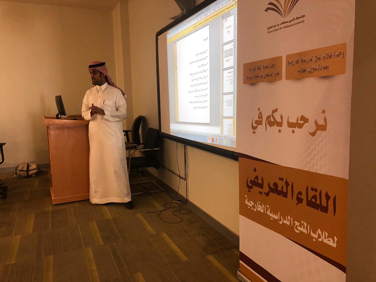 بدأ اللقاء بكلمة لوكيل عمادة شؤون الطلاب الدكتور خالد بن ناصر العاصم رحب فيه بالحضور وبين أن الهدف من إقامة اللقاء لتعريف طلاب المنح الدراسية المستجدين بالجامعة وأهدافها ورؤيتها ورسالتها.