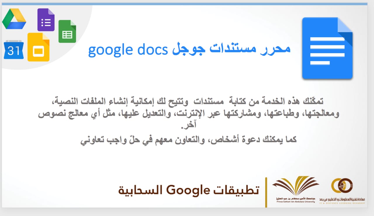 أنهت عمادة تقنية المعلومات والتعليم عن بعد ممثلةً بالقسم النسائي دورة بعنوان: "تطبيقات Google السحابية" لأعضاء هيئة التدريس قدمتها الأستاذة أريج العامر، عبر القاعة الافتراضية (Collaborate BlackBoard) اليوم الثلاثاء الموافق 11/1/1441هـ هدفت إلى التعرف على خدمات Google السحابية واكساب المدربين مهارات التعامل مع التطبيقات التعليمية، وذلك من خلال عدة محاور كان من أبرزها: التعرف على خدمة التخزين السحابي وإدارتها والتعامل مع المستندات والعروض وجداول البيانات ونماذج Google ومهاراتها وخصائصها الجديدة للاستفادة منها خلال العملية التعليمية، كما تم التطبيق بشكل عملي لما تم تعلمه خلال الدورة.