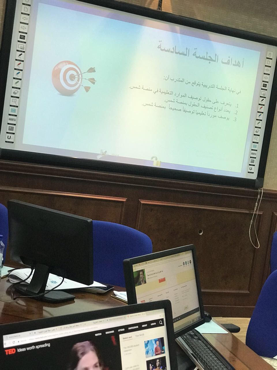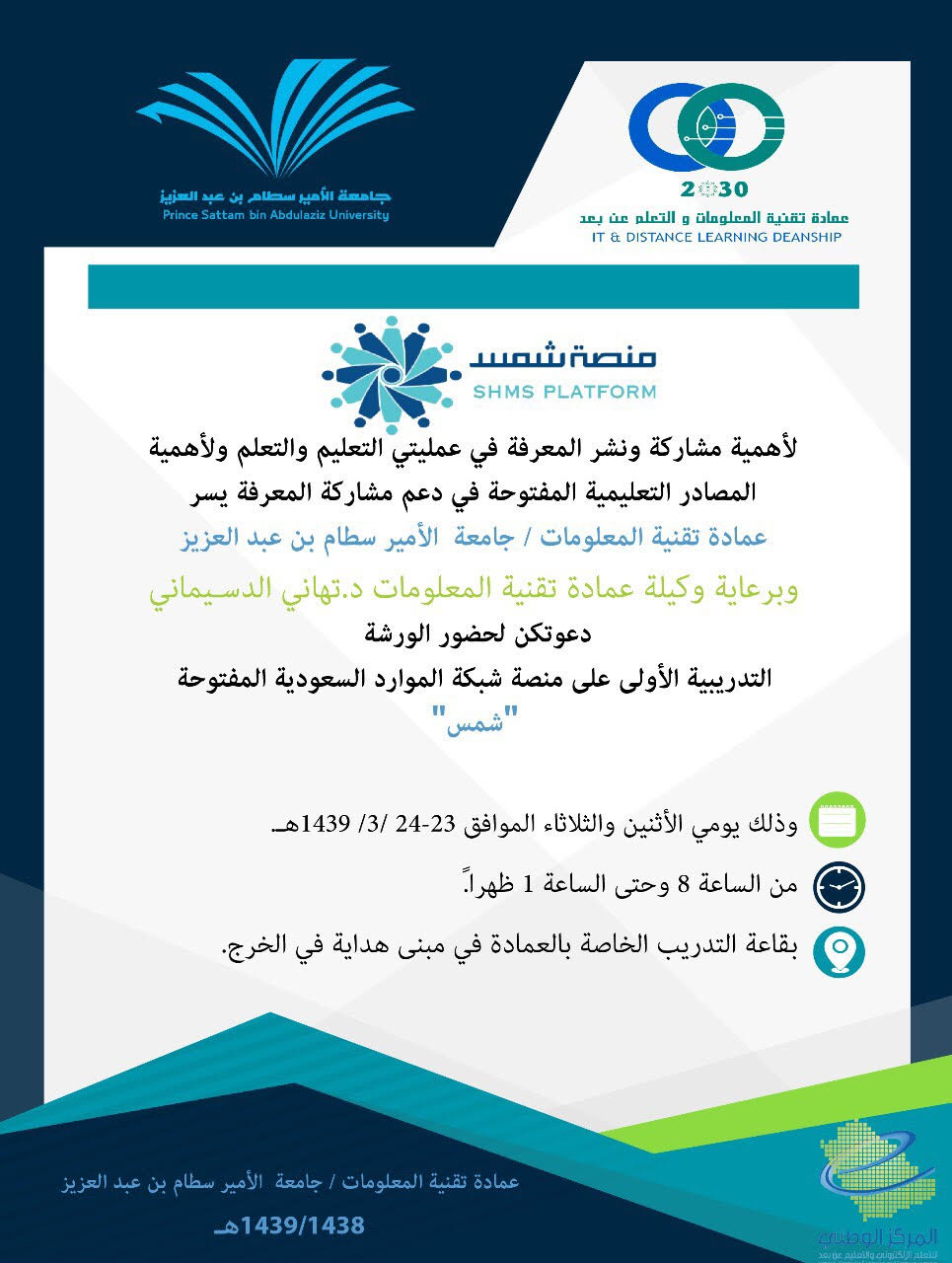 سعياً لتحقيق مبدأ الاستدامة في التعليم والتعلم وبإشراف من المركز الوطني للتعليم الالكتروني، أقامت عمادة تقنية المعلومات والتعليم عن بعد برعاية من عميدها الدكتور عبد الله البهدل ورشة عمل لشبكة الموارد السعودية المفتوحة "شمس" يوم الأثنين الموافق 23 من ربيع الأول لعام 1439هـ واستمرت على مدار يومين قدمت الورشة كل من الدكتورة تهاني الدسيماني وكيلة العمادة والأستاذة غادة العجلان مشرفة التعليم الإلكتروني بالعمادة وبحضور ٤٠ متدربة شاملة المتدربات عن بعد عبر الربط الشبكي في فروع الجامعة وقد تناولت المحاور التي تم تغطيتها بحقيبة شمس الأولى وهي التعريف بالمنصة وسبل إثرائها والدخول لها، الموارد التعليمية وحقوق الاستخدام وطرق البحث بالمنصة، تنظيم الموارد المفتوحة وتوصيف البيانات للموارد، ورفع وتأليف الدروس والوحدات وتم التعريف بمتطلبات هذه الحقيبة تمهيدا للانتقال للمستوى الثاني بعضوية شمس. وقد تم تنفيذ الورشة باستخدام استراتيجية التدريب المقلوب بحيث تم تزويد المتدربات بحقيبة المرئيات المرافقة والمادة العلمية قبل بدء الورشة وذلك للرفع من فاعلية التدريب. وتعد شمس إحدى مبادرات مركز التعليم الالكتروني وهي منصة .إلكترونية للموارد التعليمية المفتوحة تسعى لإثراء المحتوى التعليمي لدعم العملية التعليمية.