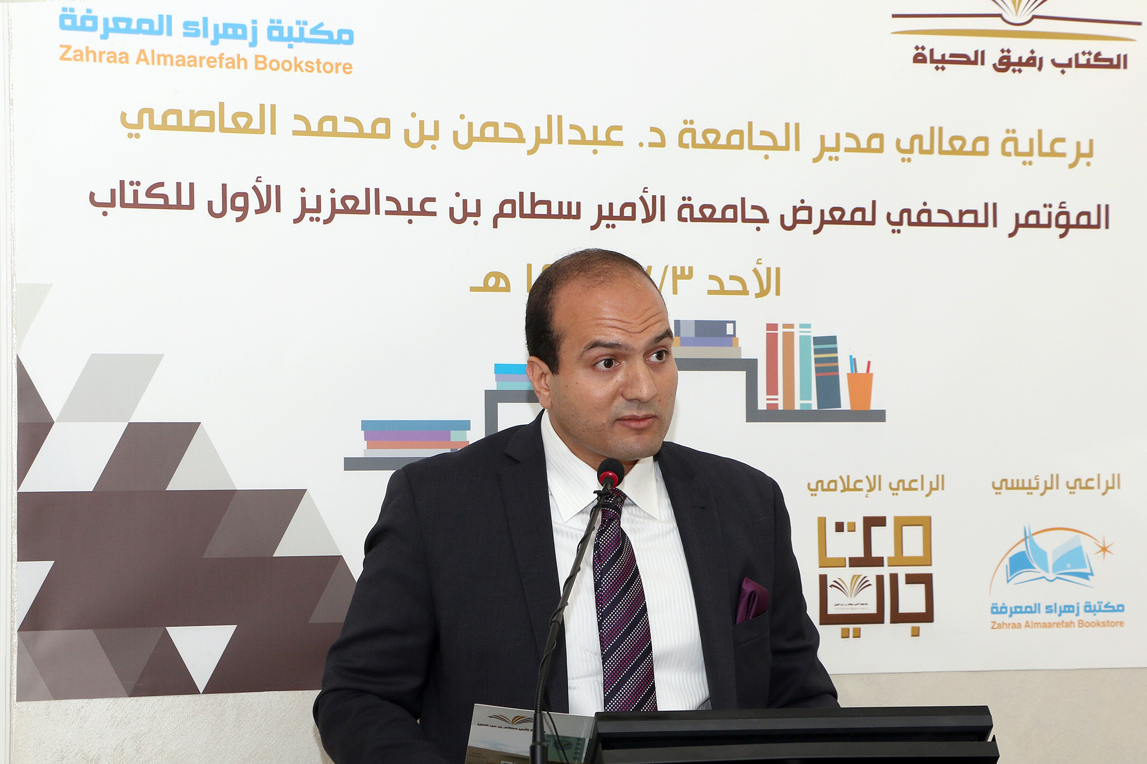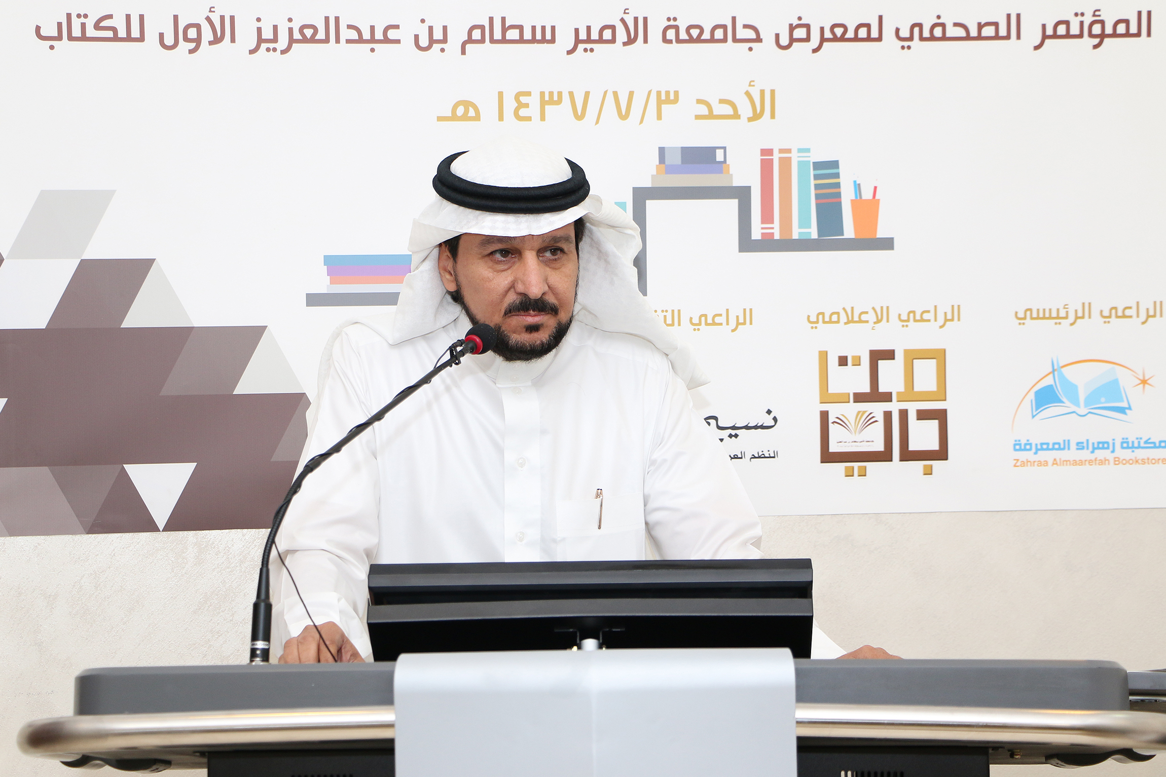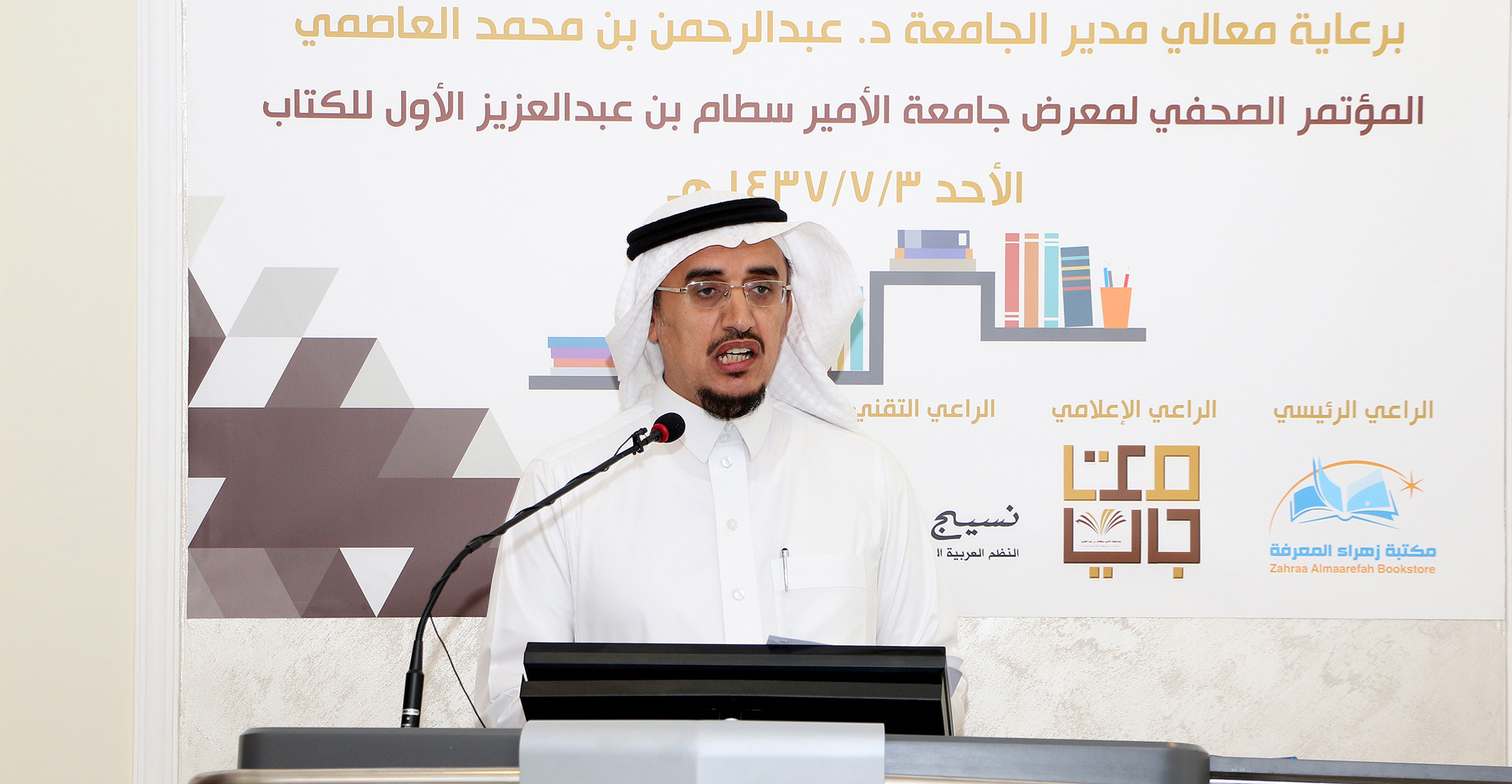 دشّن معالي جامعة الأمير سطّام بن عبد العزيز الدكتور عبد الرحمن بن محمد العاصمي ظهر أمس الحملة الإعلامية لمعرض الجامعة الأول للكتاب الذي يقام في الفترة من17 / 7 / 1437هـ وحتى 24 / 7 / 1437هـ. وذلك خلال مؤتمر صحفي أقيم في مقر الجامعة حضره العديد من الإعلاميين والصحفيين من مختلف وسائل الإعلام المختلفة الورقية والإلكترونيّة، وبحضور وكيل الجامعة للدراسات العليا والبحث العلمي الأستاذ الدكتور عبد العزيز بن عبد الله الحامد، وعميد شؤون المكتبات الدكتور راشد بن مبارك الرشود.