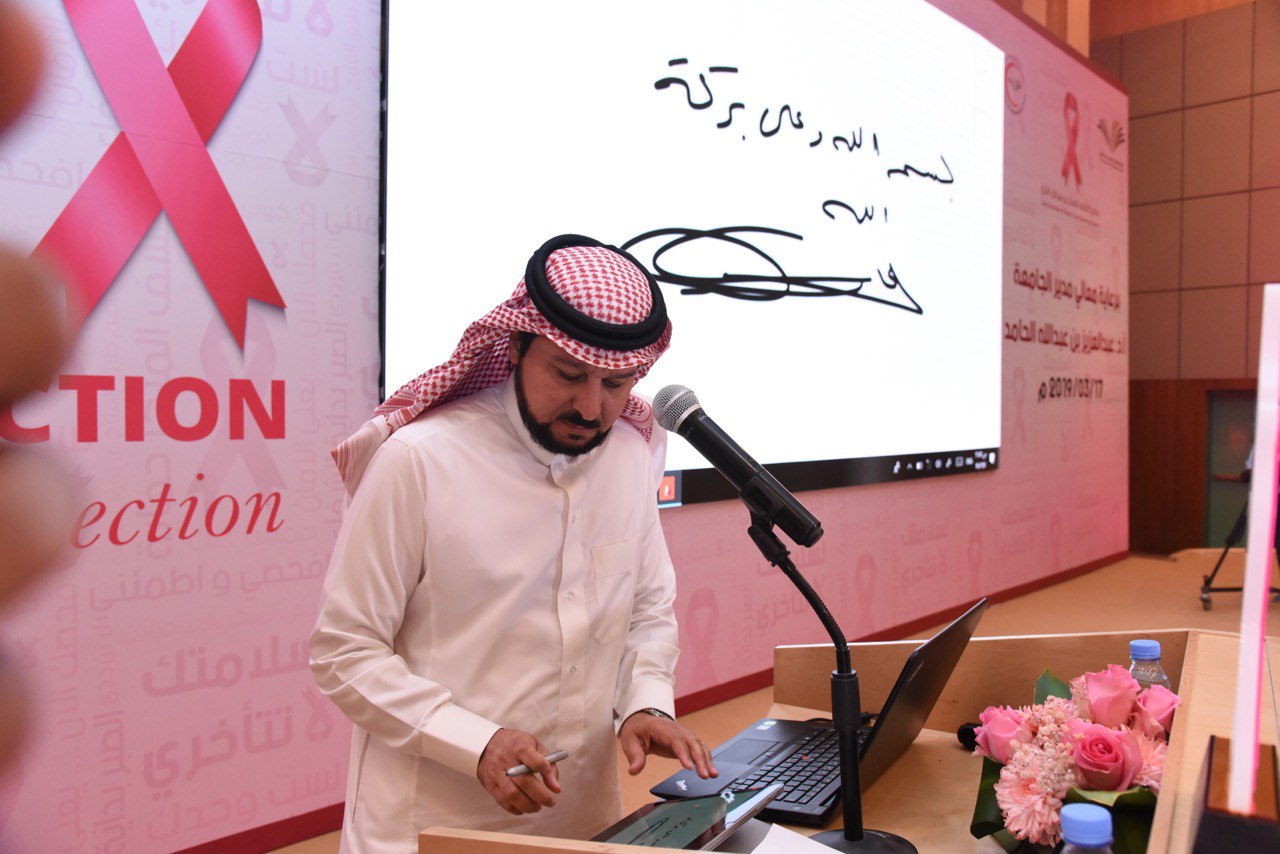 بعد ذلك دشن معالي الجامعة البرنامج وألقى كلمة بهذه المناسبة ذكرها فيها دور الجامعة في تحقيق الشراكة المجتمعية ونشر الوعي للمجتمع وشدد على ضرورة التكاتف والحرص على دعم مثل هذه البرامج من خلال المشاركة في الفحص المبكر للنساء وتشجيعهن على ذلك ونشر تلك الثقافة في المجتمع وفي ختام كلمته قدم معالي المدير شكره للمستشفى الجامعي وللحضور على مشاركتهم في هذه المناسبة .