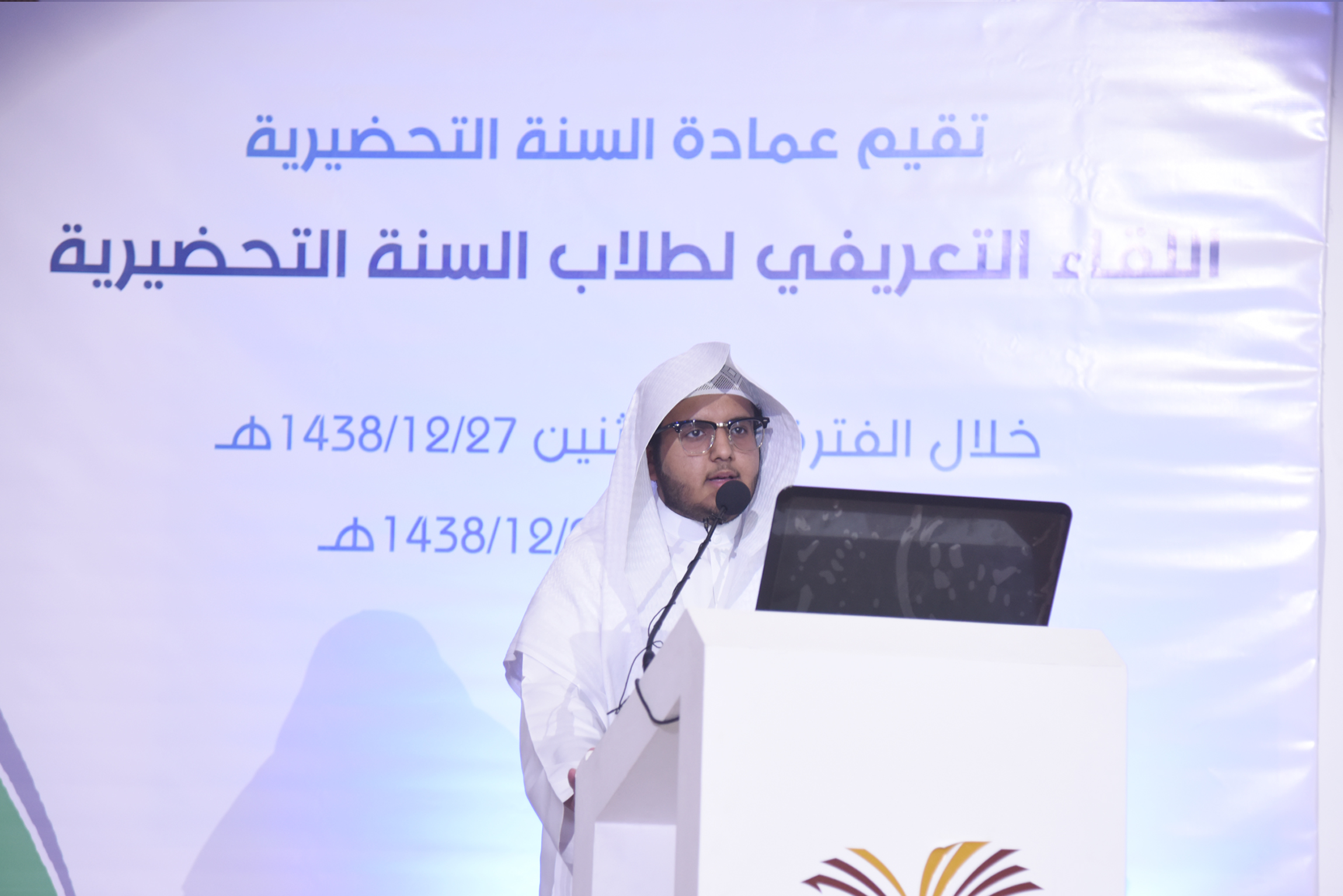 وفي نهاية كلمته قدم شرحًا وافيًا عن أهداف اللقاء التعريفي لطلاب السنة التحضيرية، الذي يتخلله العديد من الفعاليات المهمة، التي يجب على الطالب الجامعي معرفتها وخاصة طلاب السنة التحضيرية وكذلك تزويد الطلاب بمعلومات عن نظام الدراسة وآلية التخصيص بعد اجتياز الدراسة.