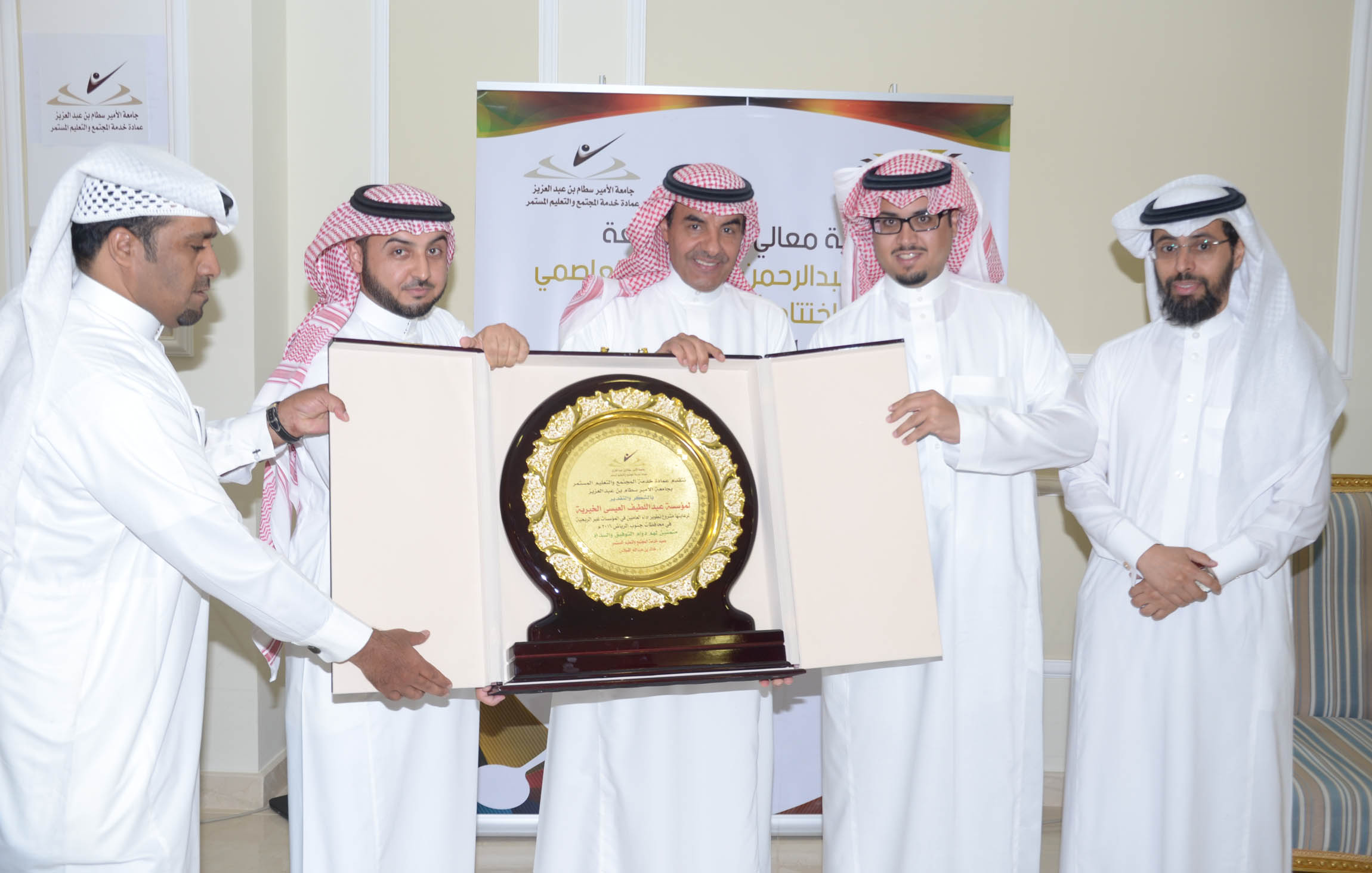 من جهته تقدم راعي الحفل معالي مدير الجامعة الدكتور عبد الرحمن العاصمي في كلمته ترحيبه بالحضور مقدماً خالص الشكر والتقدير لخادم الحرمين الشريفين على ما أولاه لهذه الجامعة من اهتمام كبير وحمد الله على ما تفضل به من خيرات على هذه البلاد وعلى نعمة الأمن والأمان والاستقرار مثمناً جهود مؤسسة عبد اللطيف العيسى الخيرية على ما تقوم به من دعم ورعايات لبرامج نوعية تساهم في تنمية ورقي الوطن ، وكذلك شكره لمجموعة الغنيم للتدريب والتعليم على تعاونهم مع الجامعة في تطوير العمل المؤسسي مع المستفيدين من العمادة ، وكذلك لمدارس فرسام الجزيرة الأهلية لرعايتهم برامج تدريبية استفاد منها عدداً من موظفي الجهات الحكومية والخاصة في المحافظة ، ثم قدم العاصمي تهنئته لمنسوبي العمادة على نجاحهم المتميز رافعاً شكره لمقام خادم الحرمين الشريفين الملك سلمان بن عبدالعزيز حفظه الله على ما يقدمه للجامعات السعودية عموماً ولجامعة الأمير سطام بن عبد العزيز خصوصاً من دعم كبير وتوفير جميع الإمكانيات لتقوم بدورها بالشكل المطلوب .