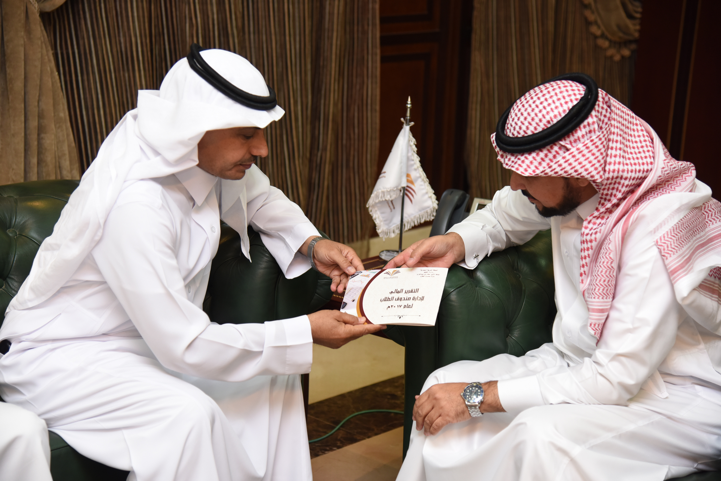 تسلم معالي مدير جامعة الأمير سطام بن عبدالعزيز الأستاذ الدكتور عبد العزيز بن عبدالله الحامد التقرير المالي والحساب الختامي للعام المالي 2017 لصندوق الطلاب، سلَّمه الدكتور ثلاب بن عبدالله الشكره رئيس مجلس ادارة صندوق الطلاب وقد تضمن التقرير عرض العديد من إنجازات الصندوق جاء من أبرزها إجمالي السلف و الإعانات المقدمة من الصندوق لطلاب الجامعة و دعم الدورات التدريبية و الأنشطة الثقافية و التوعوية و الاجتماعية و الرياضية المتنوعة.