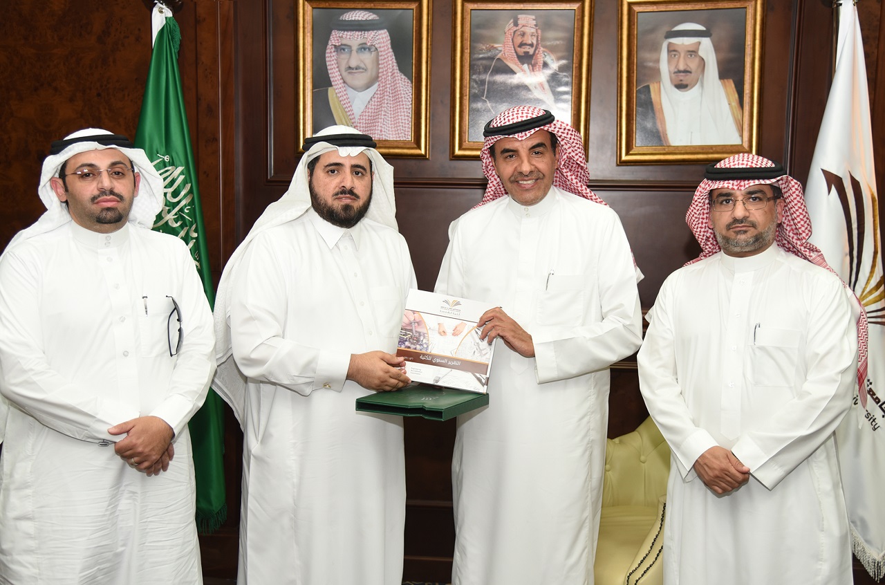 وفي ختام اللقاء قام سعادة عميد الكلية وأعضاء مجلسها بتسليم تقرير الكلية السنوي لمعاليه وأخذ بعض الصور التذكارية.