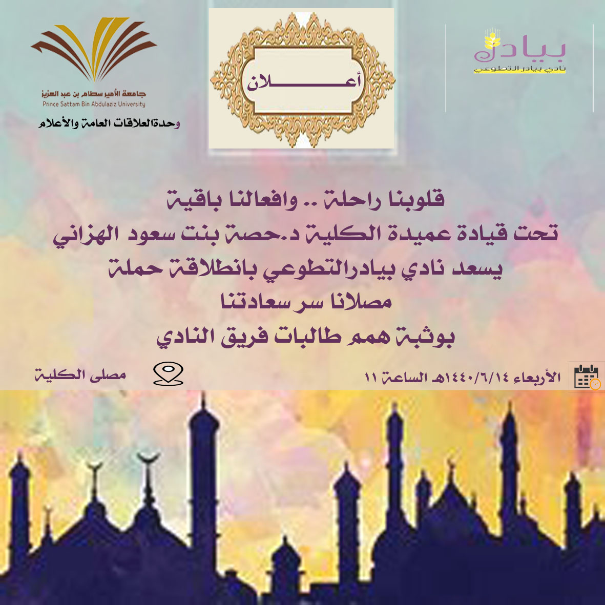 الموافق 15 /6/ 1440 هـ بتمام الساعة الحادية عشر صباحاً بإشراف الأستاذة منال الدحيم. يهدف البرنامج الى تعزيز الاهتمام بالمصلى والحرص على نظافته ووضع التوجيهات للطالبات بالحرص على مثل هذا المكان الذي تقام فيه الصلاة والذي يمثل الجزء الأكبر من الحياة حيث كانت همة طالبات فريق النادي متألقة وسامية نحو التطوع. كما تم تشغيل اذان الظهر في ساحة الكلية للتذكير بدخول وقت الصلاة. قدمت الأستاذة منال لهن كلمة بأهمية التطوع وشكرت سعيهن ودعت للاستمرار في مثل هذه المبادرات التي فيها خدمة للدين والوطن.