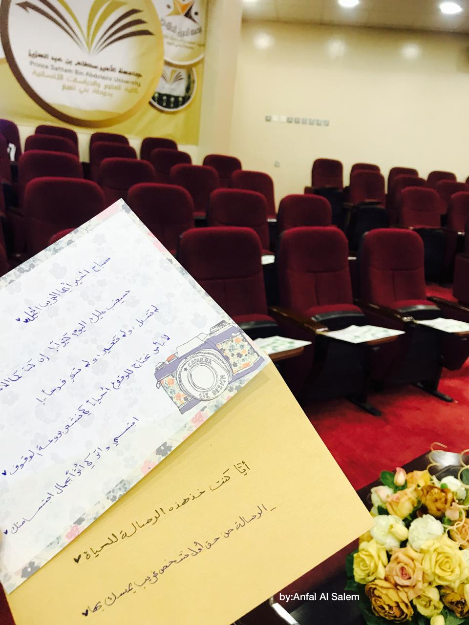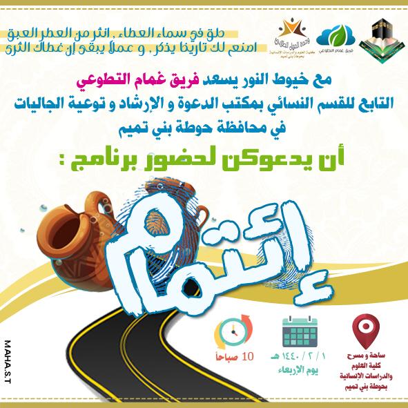 في مبادرة تطوعية فريدة من نوعها، وبإطلالة من فريق غمام التطوعي التابع لمكتب الدعوة والارشاد وتوعية الجاليات القسم النسائي بمحافظة حوطة بني تميم، أقيم برنامج بعنوان (إئتمام ) يوم الأربعاء الموافق 1/ 2/ 1440هـ في تمام الساعة ١٠ صباحاً في مسرح وساحة كلية العلوم والدراسات الإنسانية بحوطة بني تميم.