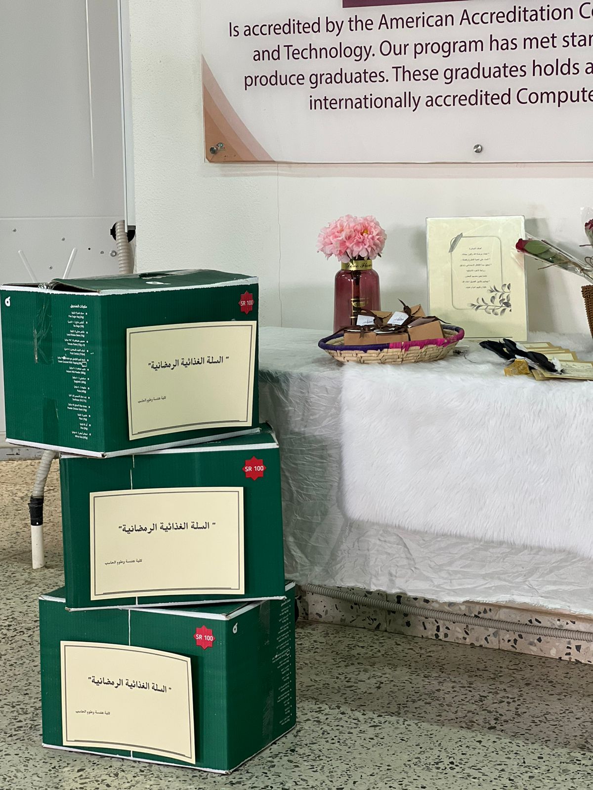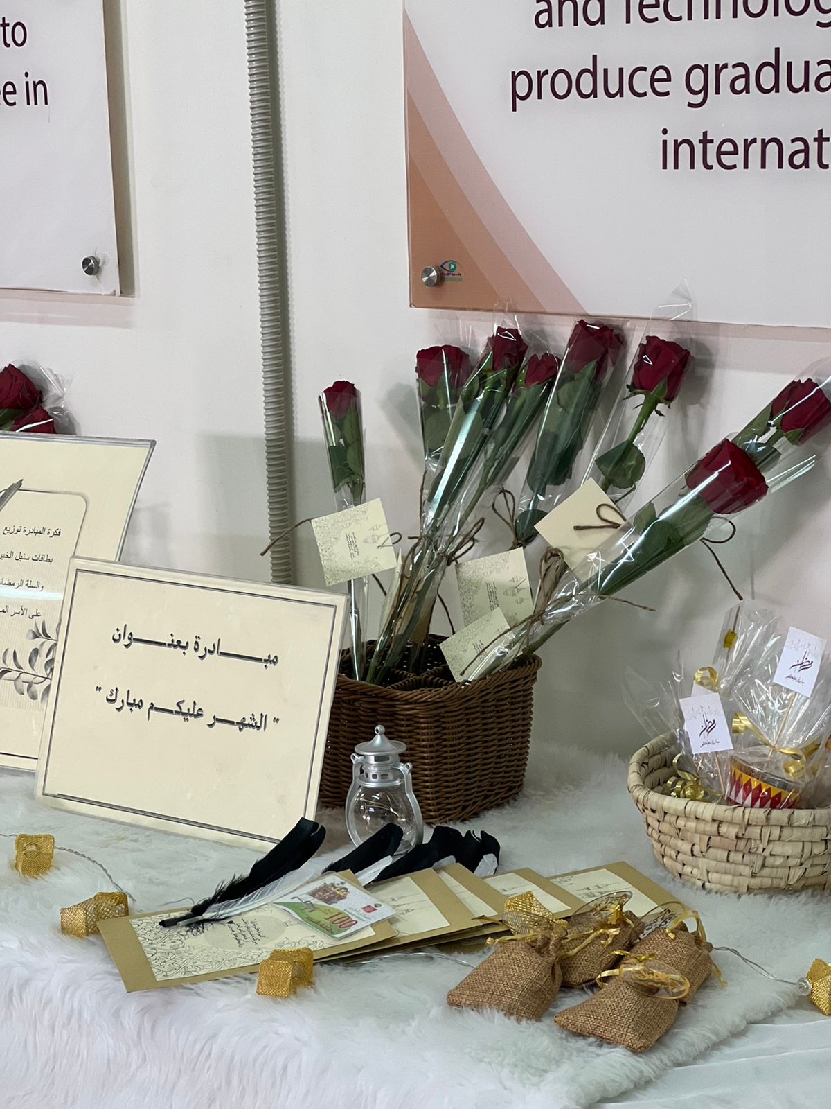 تحت رعاية وكلية كلية هندسه وعلوم الحاسب د. الهام كريري تم تنظيم مبادرة بعنوان " الشهر عليكم مبارك " لدعم الأسر المحتاجة يوم الثلاثاء الموافق 19/08/1443هـ في بهو الكلية بإشراف منسقة العمل التطوعي أ. رفعه الدوسري وبمشاركات بعض من موظفات الكلية واعضاء هيئة التدريس.