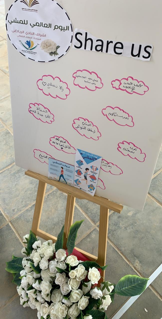 نظمت الأنشطة الرياضية بعمادة السنة التحضيرية -قسم طالبات يوم الثلاثاء الموافق 1441/4/6هـ مبادرة بعنوان " يلا نمشي "حضر الفعالية عدد من الطالبات. وتضمنت المبادرة التوعية بأهمية المشي وفوائده الصحية والنفسية على الجسم وأن قلة الحركة والخمول واستخدام التقنية بشكل بفرط سبب بانتشار امراض العصر كالسمنة والسكري وضغط الدم. وتضمنت أيضا ً إنشاء مضمار مصغر للمشي مبينين أن رياضة المشي تتميز بسهولة ممارستها في أي وقت ومكان، ولا تحتاج إلى تجهيزات، ولا إلى زي خاص، أو معدات خاصة، بل تحتاج إلى حذاء رياضي مريح للقدم فقط . كما انها مناسب لجميع الفئات والأعمار . وقد لاقت المبادرة استحسان الطالبات وأثار فيهن الحماس والنشاط وشجعتهن على ممارسة الرياضة ولو ١٠ دقائق في اليوم .