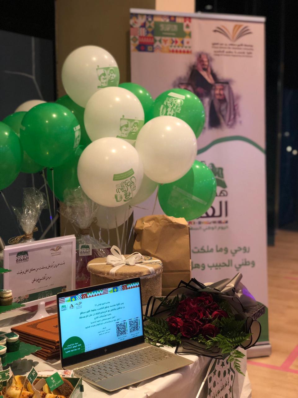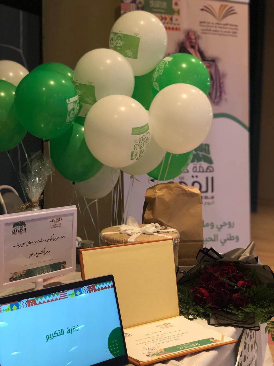 تحت قيادة وإشراف سعادة وكيلة كلية هندسة وعلوم الحاسب د. هيا العسكر نظمت الموظفات أ.لطيفة الشمران من مكتب وحدة التدريب الطلابي ووحدة الخريجات وأ.غالية مرير من مكتب شؤون الطالبات مبادرة الاحتفاء باليوم الوطني 90 تحت شعار همة حتى القمة لعام 1442هـ -2020م وذلك بالتعاون مع نادي مخيم اللياقة يوم الثلاثاء 12/02/1442هـ الموافق 29-9-2020م في تمام الساعة السادسة مساءاً، حيث استهل اللقاء بالنشيد الوطني ثم مقدمة وعرض فيديو تأسيس عن المملكة وثم قصيدة وثم مشاركات المسابقات ثقافية والمسابقات ترفيهية وحركية خاصة بمشاركة منسوبات نادي مخيم اللياقة من موظفات الإدارة والمدربات والمشتركات النادي وفقاً بالتقيد بالإجراءات الاحترازية من ضرورة لبس الكمامات، التباعد، وقياس درجة الحرارة كل من يدخل النادي واستخدام المعقمات وغيرها من لوائح والإرشادات الاحترازية وضعتها النادي وذلك لمواجهة جائحة كورونا وأوصت إدارة النادي على ضرورة الالتزام بها حفاظاً على سلامة الجميع، وفي نهاية مبادرة الاحتفاء باليوم الوطني 90 تحت شعار همة حتى القمة تم تكريم إدارة النادي والمشرفات .