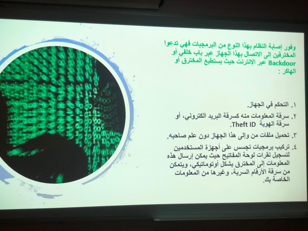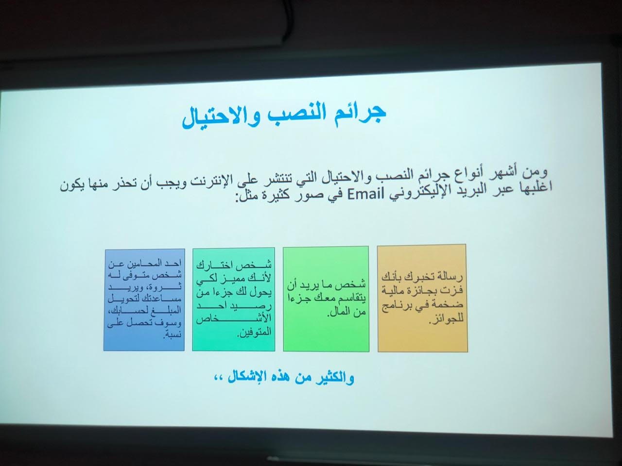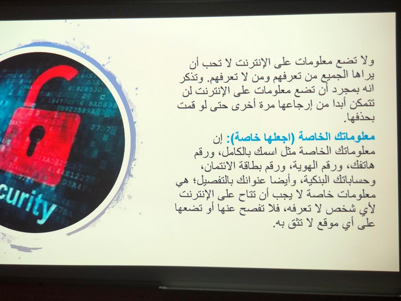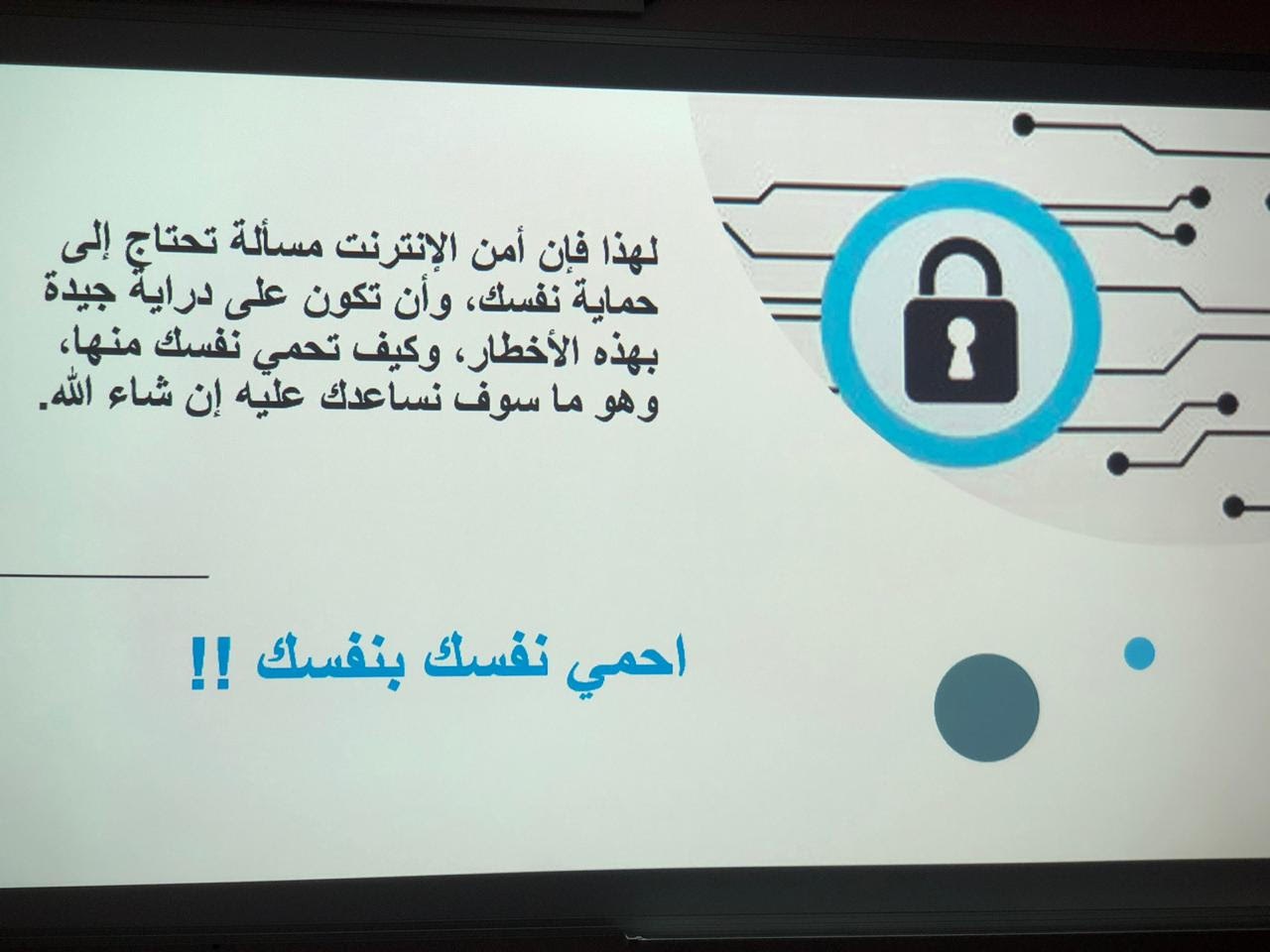 من تقديم الأستاذة/ سارة القحطاني. حيث هدفت المحاضرة إلى توضيح التعريف بمصطلح الجرائم الالكترونية وأسبابه والتعدي الالكتروني وأساليب التجسس والاحتيال بالإضافة الى تعريف الحضور بكيفية مكافحة الجرائم الإلكترونية وحماية بياناتهم وخصوصيتهم والتطرق الى سبل التواصل مع مؤسسات تحمي الفرد من الجرائم الالكترونية وانتهت المحاضرة بنصائح مهمه للحضور والإجابة على استفساراتهم.