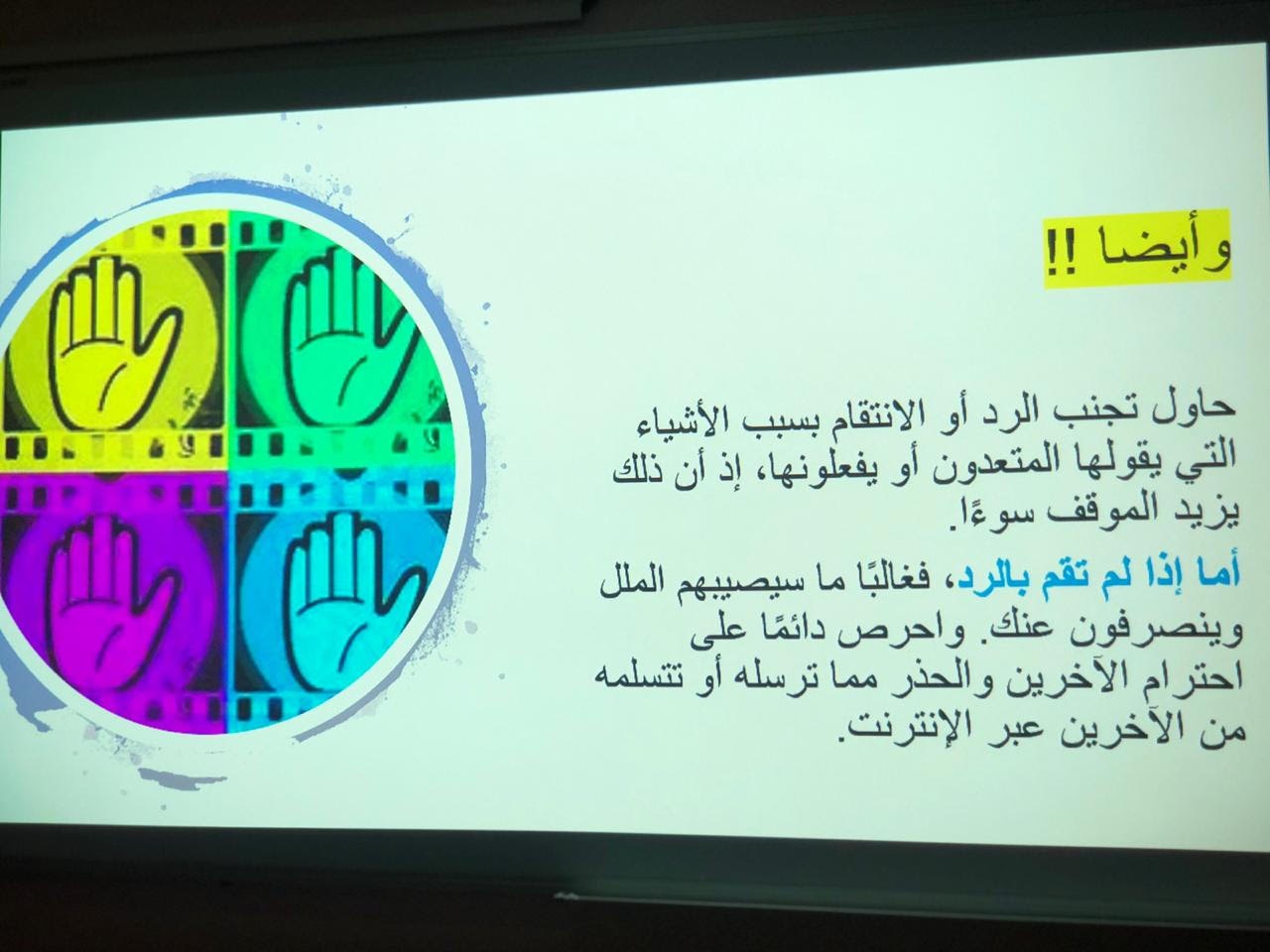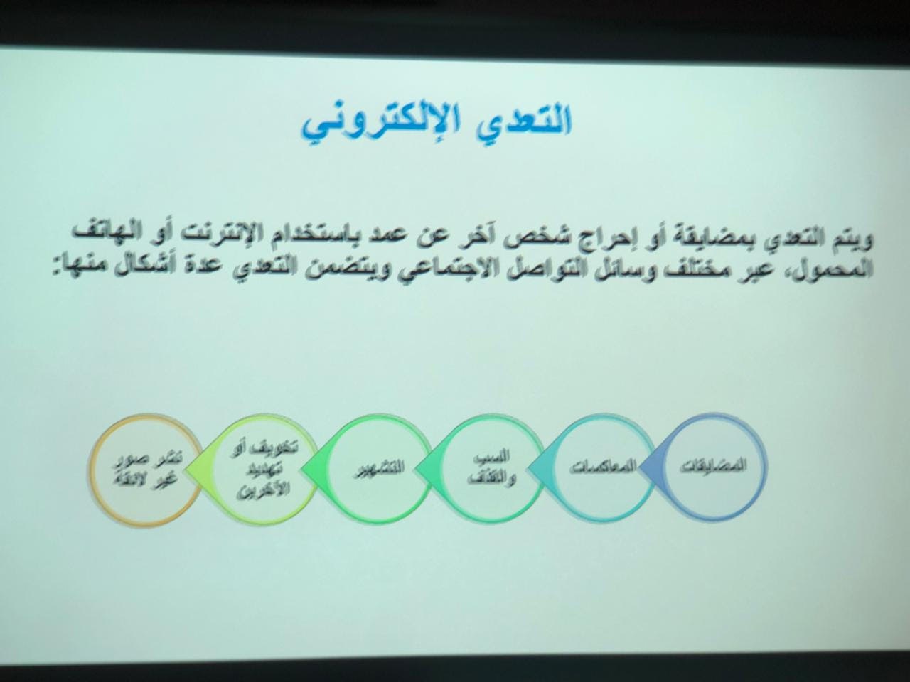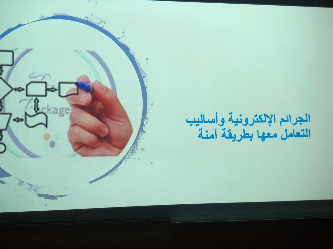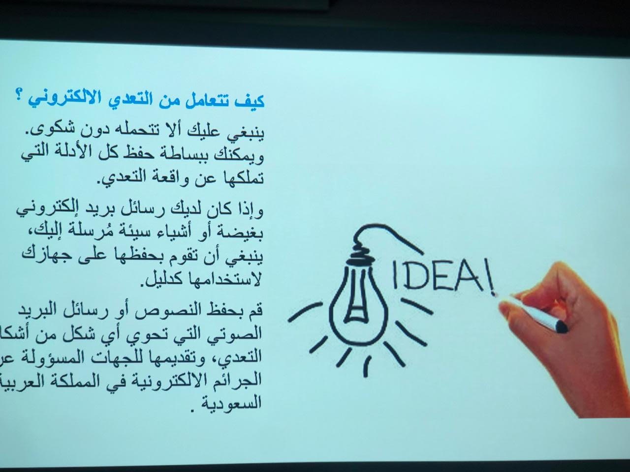 من تقديم الأستاذة/ سارة القحطاني. حيث هدفت المحاضرة إلى توضيح التعريف بمصطلح الجرائم الالكترونية وأسبابه والتعدي الالكتروني وأساليب التجسس والاحتيال بالإضافة الى تعريف الحضور بكيفية مكافحة الجرائم الإلكترونية وحماية بياناتهم وخصوصيتهم والتطرق الى سبل التواصل مع مؤسسات تحمي الفرد من الجرائم الالكترونية وانتهت المحاضرة بنصائح مهمه للحضور والإجابة على استفساراتهم.